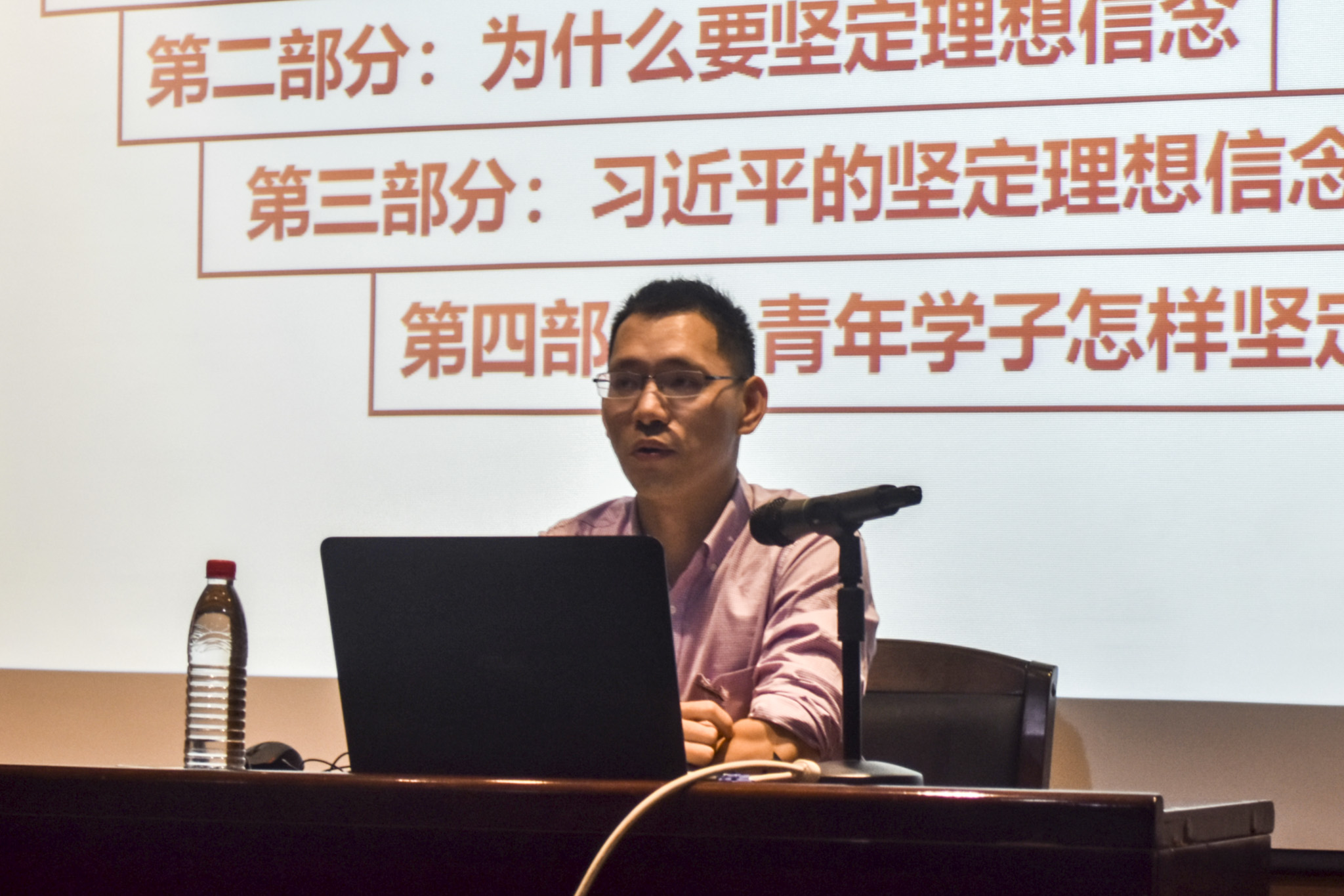 紧接着第二个部分,张老师借苏联解体的事例讲解了坚定理想信念的重要性,并列举许多习总书记关于理想信念的话,并以此引出第三部分的讲述-习总书记的坚定理想信念之路。张老师详细讲述了习总书记知青和入团入党的艰辛历程,体现了习总书记理想信念的坚定。