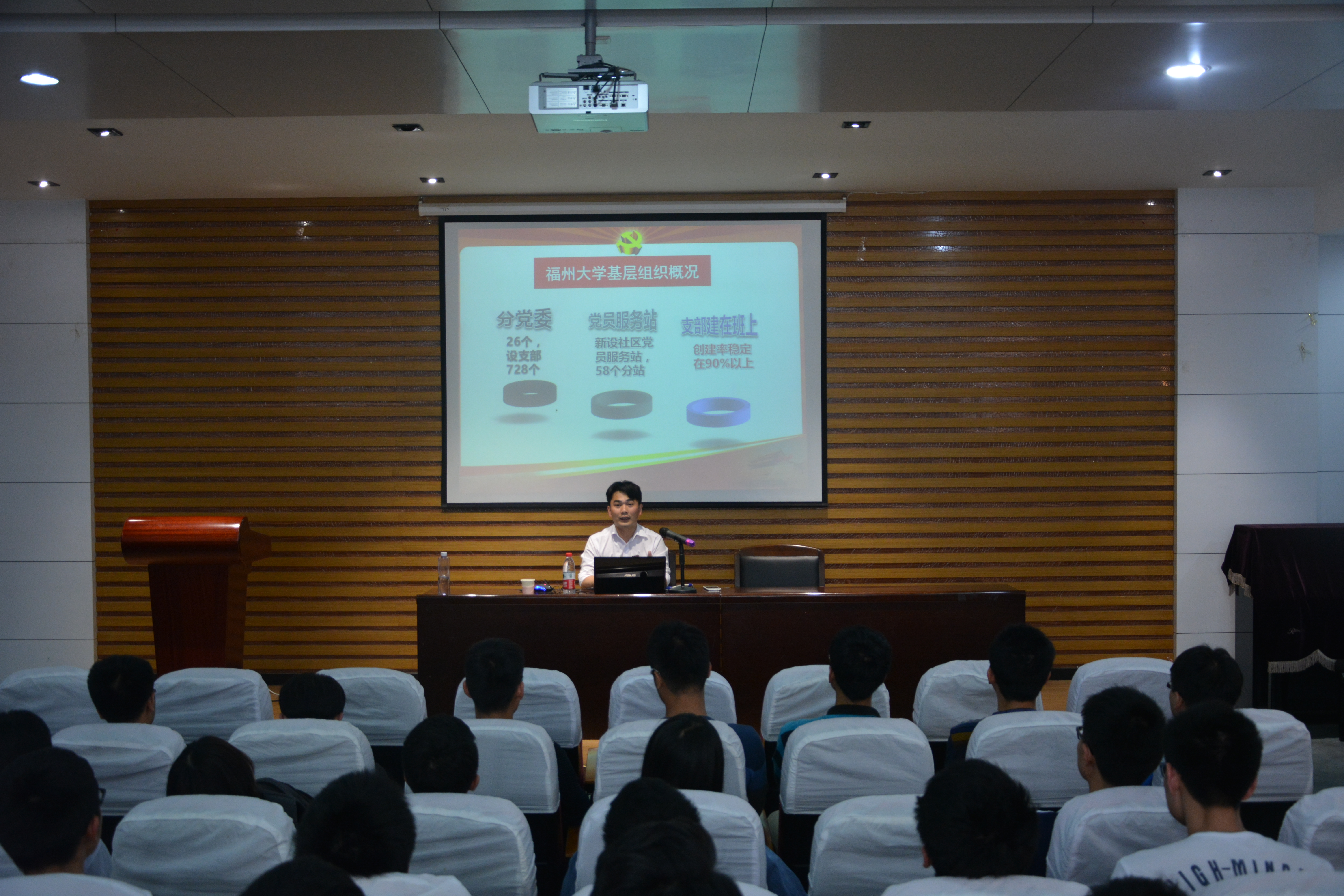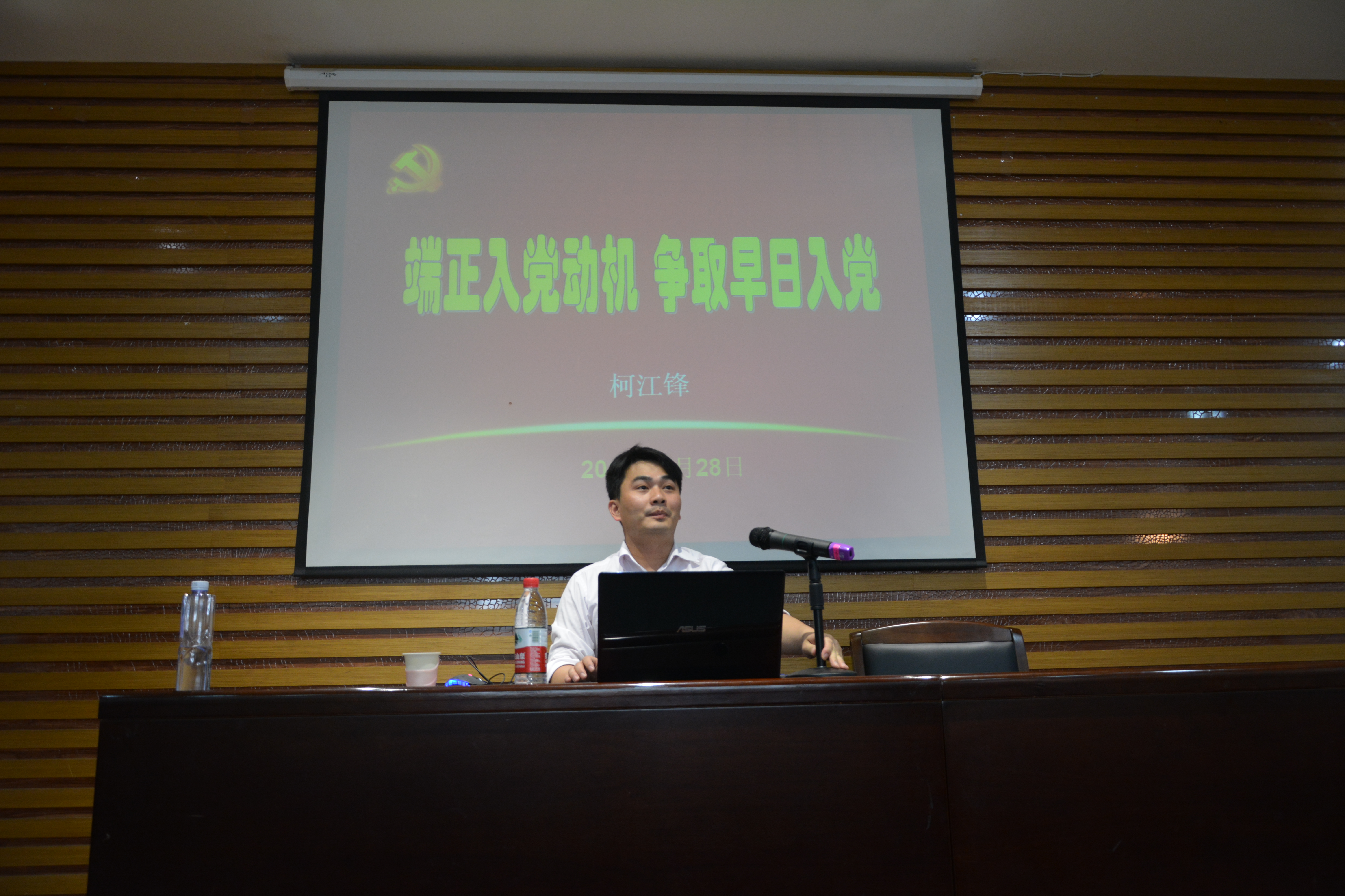党课开始前十几分钟,同学们就已全部到场,期待着党课的开始。在主持人对柯江锋老师进行了简单介绍后,党课正式开始。本次党课柯江锋老师以"端正入党动机,争取早日入党"为主题,对入党积极分子们进行入党培训。首先,柯江锋老师向入党积极分子们介绍了党的基层概况,以福大为切入点,告诉入党积极分子入党所需了解的基本情况。其次,柯老师从入党积极分子的入党动机类型分析,正确的入党动机及其内涵以及大学生如何端正入党动机三个方面对入党动机进行了诠释,鞭策入党积极分子们要树立正确的入党动机。最后,柯老师通过四句箴言与同学们共勉,本次党课至此结束。上课的入党积极分子们都表示这次的党课受益匪浅,令他们从柯老师的精彩演讲中更加坚定了自己对中国共产党的信念。