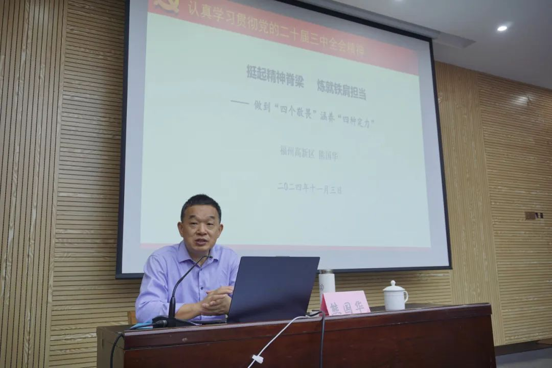 11月3日上午,人工智能与智能制造学部2024年秋季学期发展对象培训班第五讲在电气学院楼北230举办。本讲党课有幸邀请到福州高新区党工委委员、机关党委书记、闽江师专客座副教授熊国华老师作《挺起精神脊梁 炼就铁肩担当》专题党课授课。