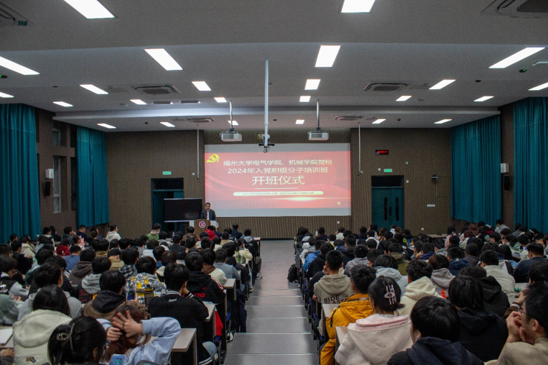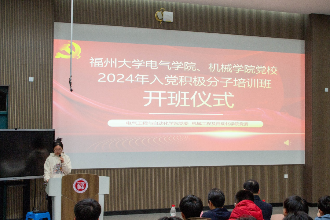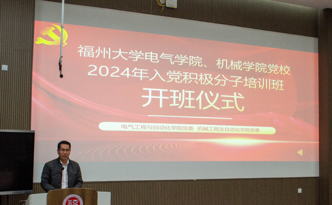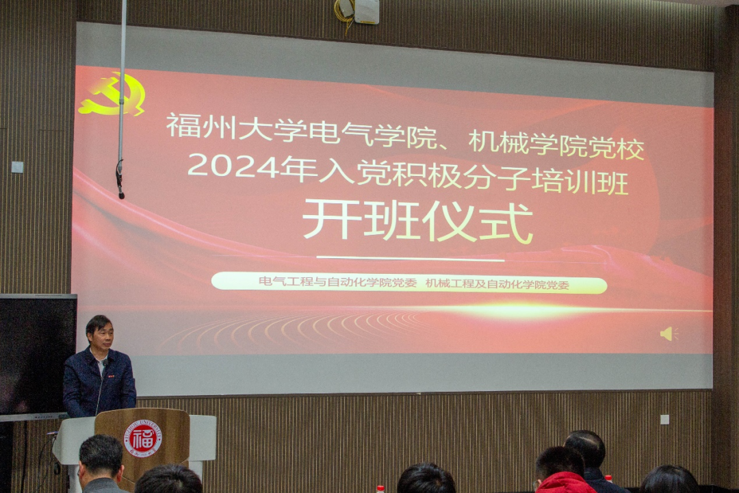 电气学院与机械学院联合举办2024年入党积极分子培训班在旗山校区东2-100顺利开班。出席本次开班仪式的领导老师有电气学院党委书记潘志辉、机械学院党委副书记孙鋆、电气学院党委副书记杜领军、电气学院团委书记李金土、机械学院辅导员李辉容以及电气学院辅导员黄莹莹。活动由杜领军老师主持。