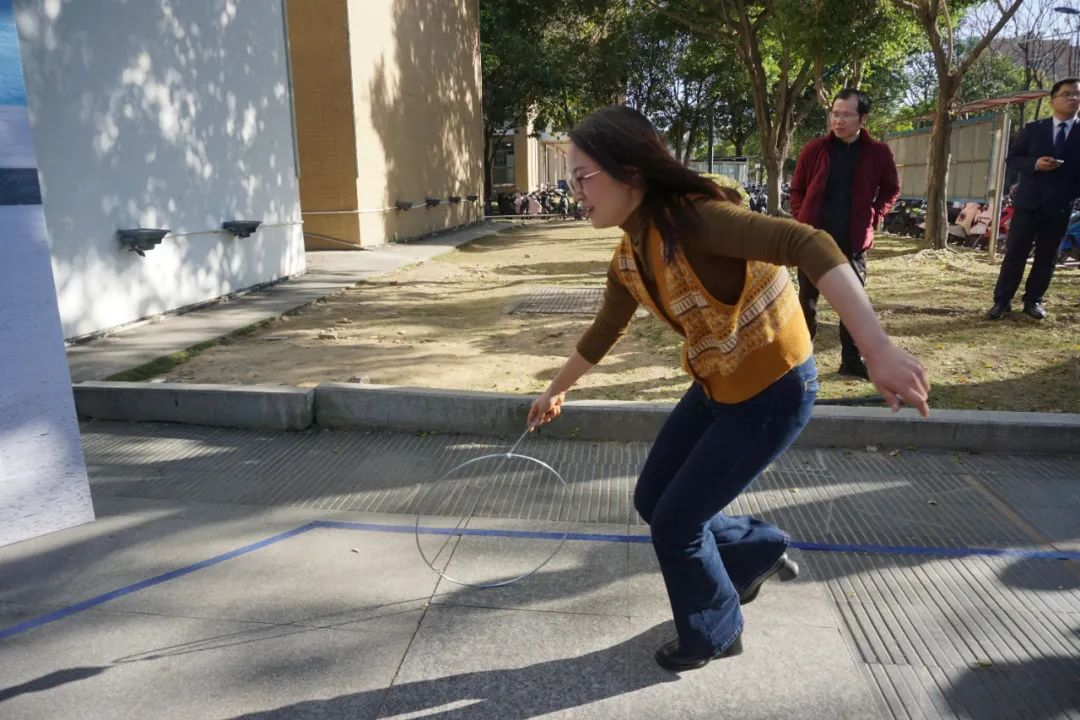 “沙包定点投篮”项目中,老师们站在投篮线外,依次用沙包投篮。沙包离手的瞬间,仿佛时间凝固,所有目光紧紧锁定目标。沙包在空中划出一道华丽的弧线,似乎与每位老师的心跳同频共振。每个成功或失败的投篮瞬间都成为了一段难忘的回忆,尽管有时沙包未中目标,却收获了满满的掌声。