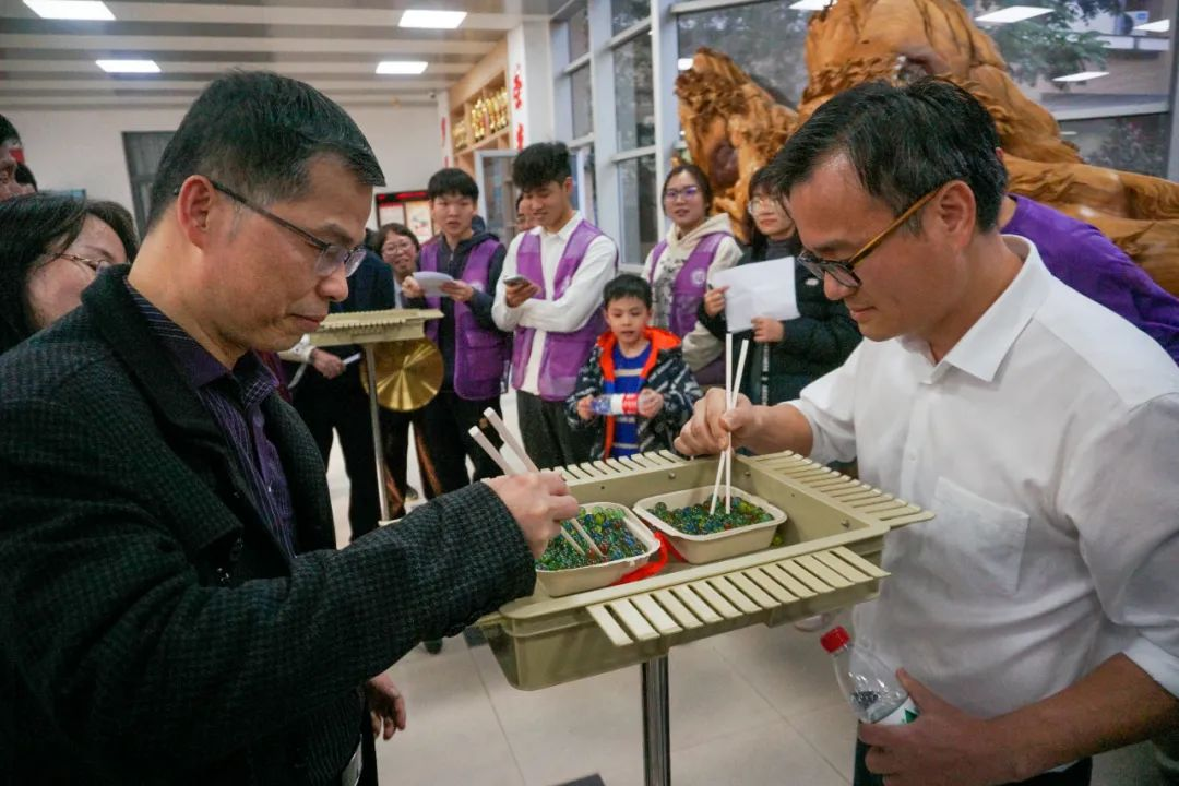在“筷子夹弹珠”项目中,老师们展开了一场速度与灵活度的比拼。一群人,一条心,一起拼。通过巧妙的技巧和灵活的手腕,老师们竞相夹取弹珠。每一次成功的夹取都引发阵阵欢呼声,展现了老师们的技巧与巧思。