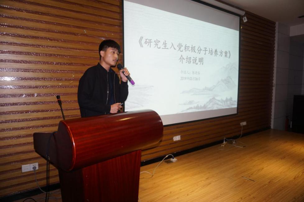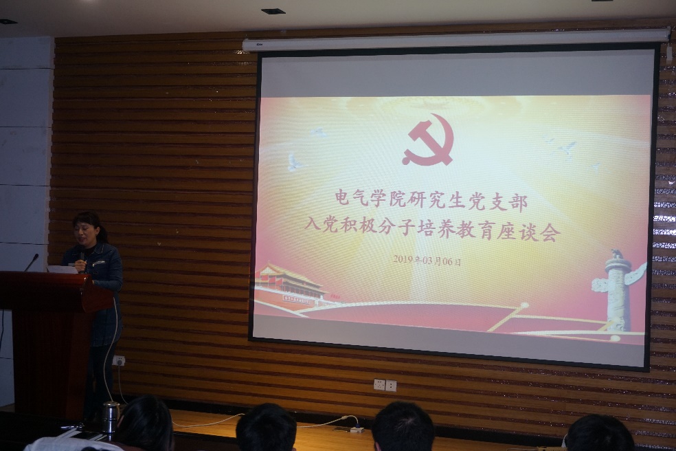 接下来,电力研究生党支部书记陈晓榕为全体参会入党积极分子解读电气学院《研究生入党积极分子培养方案》,号召全体入党积极分子主动参与党组织的活动。