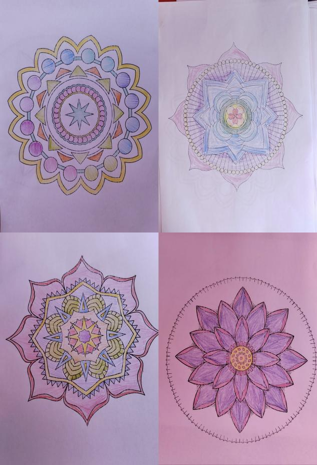 3.曼陀罗绘制:同学们选择感兴趣的曼陀罗绘画模板进行绘制,并根据自身的联想和感悟为作品添加文字介绍并取名。