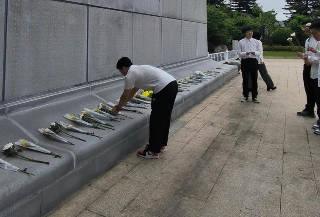 站在刻有牺牲烈士姓名的石碑前,师生们分别为烈士们献上鲜花。愿这些鲜花能够陪伴烈士们安息,也愿他们的精神永远激励我们前行。