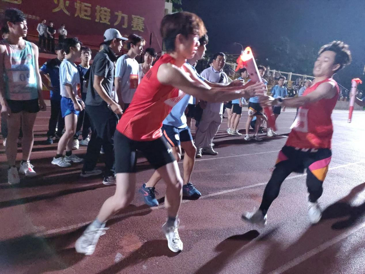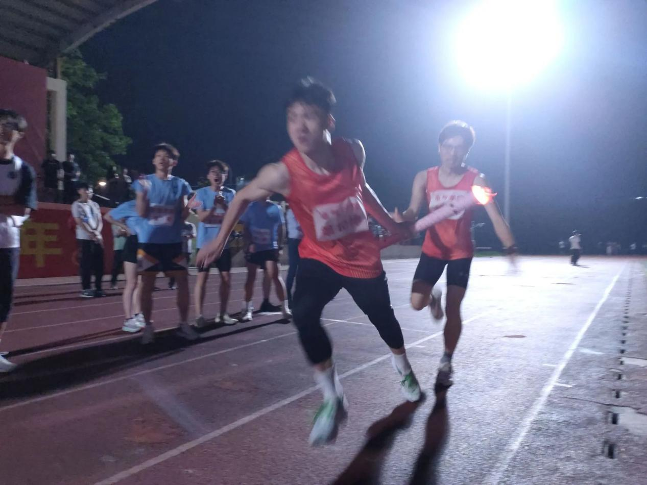 学子迈进向前,似风般穿行在第一田径场的塑胶跑道上,“五四”火炬也在有序交接,薪火相传。