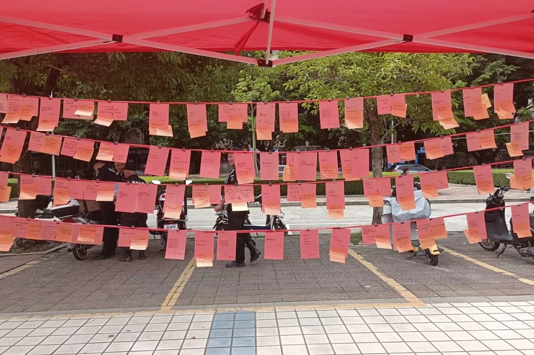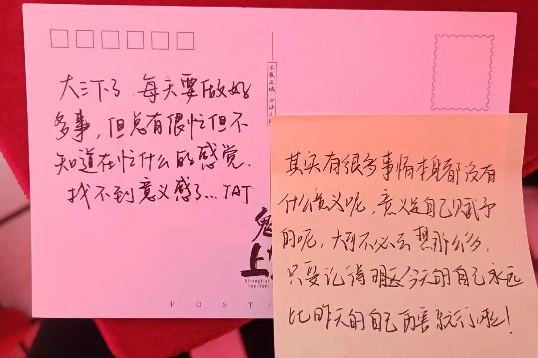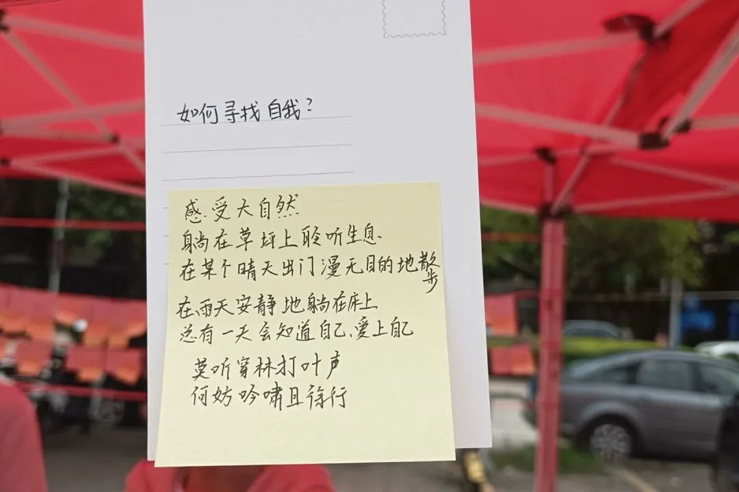 在情绪粉碎机活动中,参与者可以选择写下自己的烦恼,或者替他人解忧。在活动现场,有的同学在明信片上写下自己的烦恼与忧愁,让烦心事随笔墨倾泻而出;有的同学则选取一张烦恼明信片,给予安慰或提供解决方法,并用便利贴贴在相应明信片上。而工作人员则作为纽带,将便利贴上的暖心话语传达给留下烦恼明信片的同学,用文字传递温暖与力量。