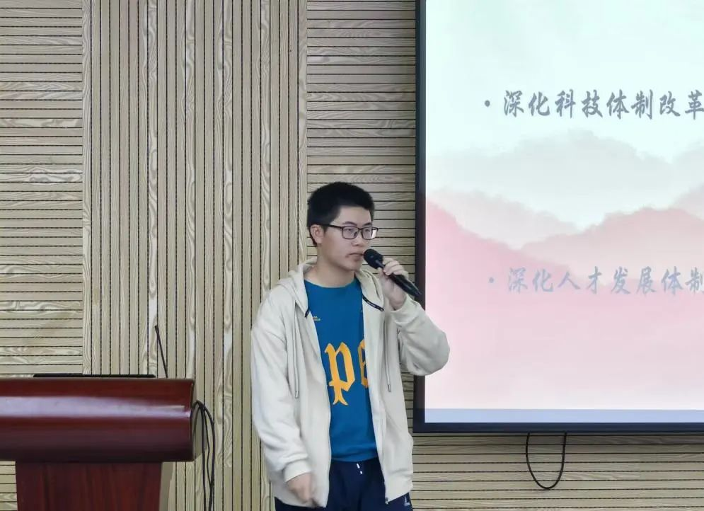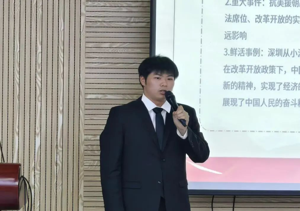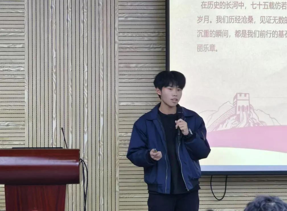 十三号选手潘世贤讲述了新中国成立七十五周年以来的风雨历程,介绍了二十届三中全会的精神内涵。引导同学们思考如何在新时代的多元场景中,弘扬全会精神,以实际行动展现新时代青年的新风貌。