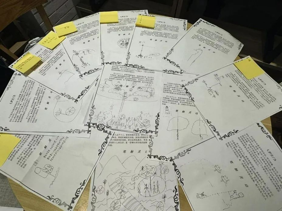 分享人继续讲述了释迦牟尼佛祖与犍陀多的故事《蛛丝》:犍陀多因未踩死一只蜘蛛而得到救赎机会,但因自私导致机会丧失,最终与他人一同坠回地狱。随后,分享人让同学们绘画这个场景,大家立即响应。手中的笔在纸上迅速移动,沙沙作响,仿佛是思想的火花在空气中跳跃。有的紧锁眉头,笔尖在纸上快速勾勒出地狱的火焰和犍陀多挣扎的形象;有的则面带沉思,细致地描绘着佛祖慈悲的面容和犍陀多脚下的蜘蛛。每个人的画作都不尽相同,但都充满了对故事的理解和个人的创意。