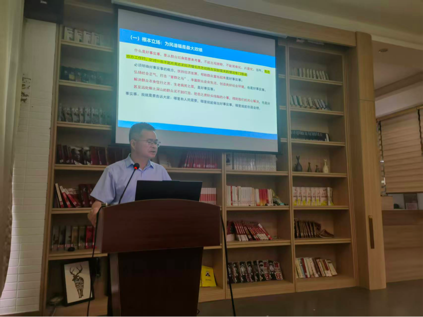 马克思主义学院副院长刘有升教授作《为人民出政绩 以实干出政绩》的专题辅导报告。学院党委副书记杜领军以及全体专兼职辅导员、研究生会、团委学生会骨干齐聚一堂,以学铸魂、以干立心,共上一堂思想深刻、实践导向的政治理论课。