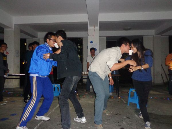 在主持人曾蕴华同学精彩的开场词后,本次趣味活动正式拉开了帷幕。首先,在场的同学通过抽签决定分组,男女生两两配对,进行登记、领号。第一 个游戏名叫“你画我猜”,一个人比划卡片内容,另一个人负责猜词。由于卡片上写的都是最近的流行用语,极大地调动了同学们的积极性,充分发挥自己的想象力 和肢体语言的魅力。在场外观看的同学们都忍俊不禁,跃跃欲试,现场气氛逐渐升温。第二个游戏“气球快跑”,由男女生配合,不依靠四肢,夹气球折返跑十米, 用时最短者胜。第三个游戏便是最受期待的“歌名竞猜”,每组参赛选手听到前奏后进行抢麦,说出歌名并演唱则视为猜对,猜对多者胜。游戏一开始大家就充分展 现了自己的歌唱才能,许多选手在唱出一两句歌词后仍紧握麦克风不放,尽展歌喉。接下来,同学们还参加了“杯水传情”、“报纸游戏”、“记情报”等趣味游 戏,整个现场欢笑声不断,热闹非凡。许多现场配对的同学因游戏拉近了距离,成为了好朋友。最终,累积积分最高的参赛队伍获得光棍节神秘大礼电影通票,更有 巧克力等奖励。现场还评选出了一对最佳人气奖,送出人偶花束一对。在一片欢笑声中,主持人宣布活动结束。