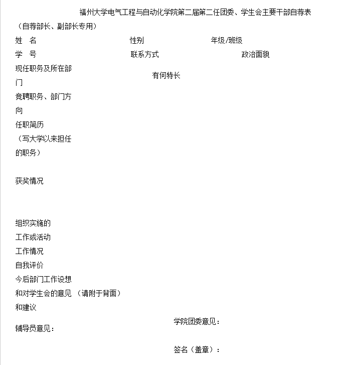 第二届第二任团委、学生会主要干部自荐表》报辅导员审核后向院团委组织部报名。截止时间2013年5月20日。报名完毕后,学院将对应聘者的资格和能力(工作设想、学业成绩、工作表现、师生评价、综合素质等)进行考核,并在各部门内部进行公开竞选,对通过考核的应聘者在全院范围内予以公示。