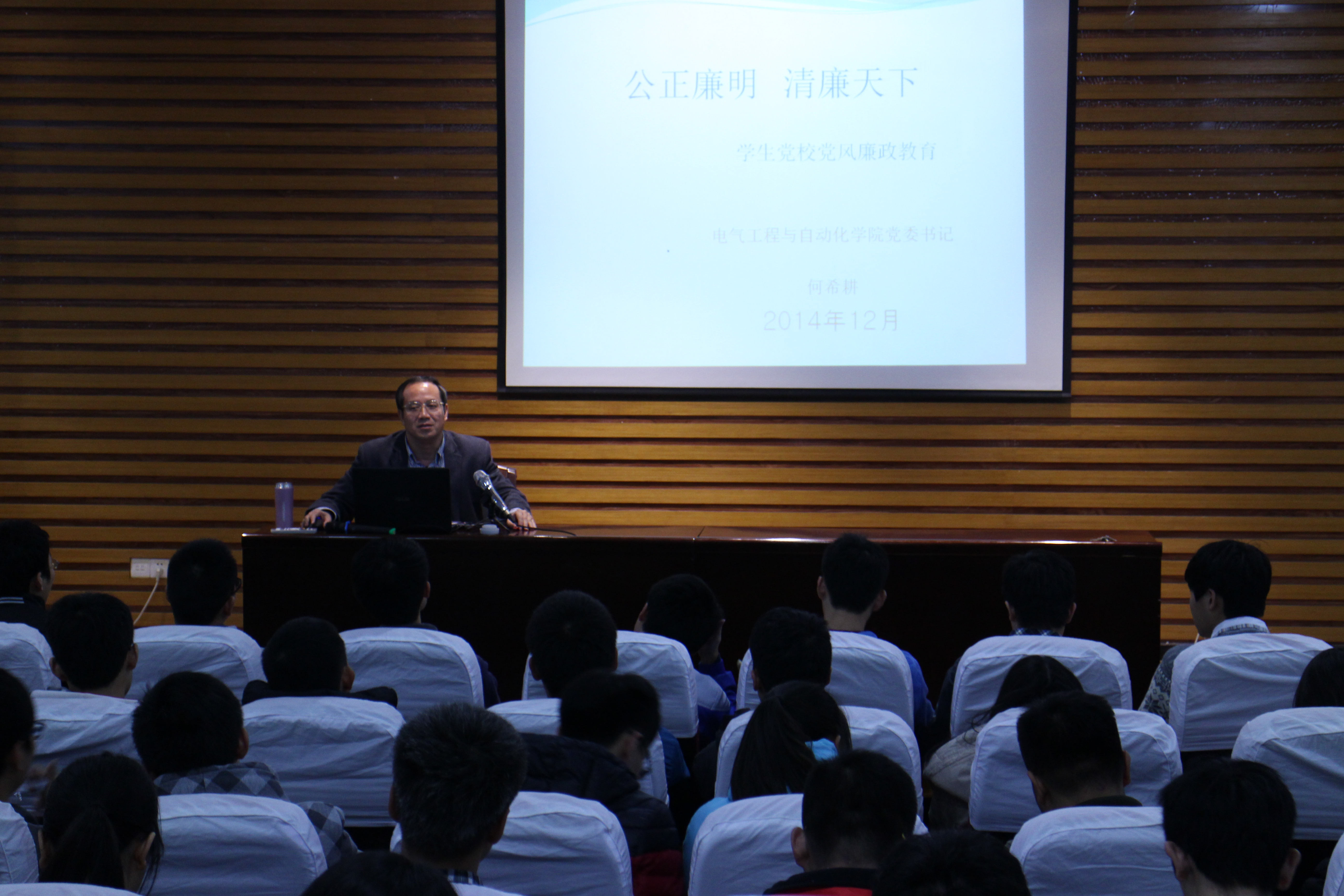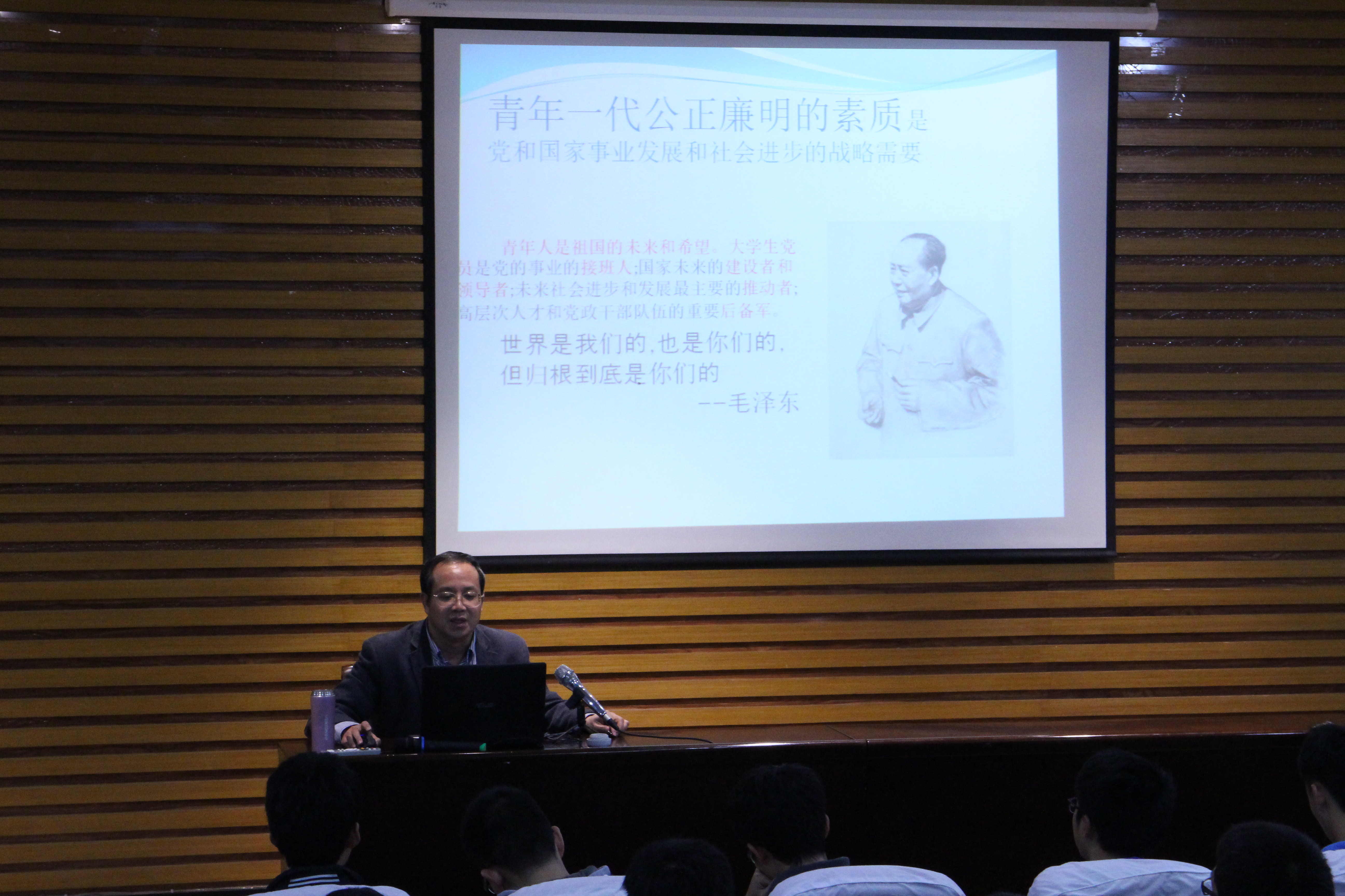 在讲座中,何书记主要从两个方面来进行本次廉政主题讲座。他首先提出廉政是一个沉重又必需的讨论话题,中国目前的腐败现象严重,青年一代的公正廉明的素质是党和国家事业发展和社会进步的战略需要。何书记介绍了党的十八大关于反腐倡廉的有关精神,要求同学们正确认识当前党风廉政建设的形势,联系实际存在的问题并简要介绍了我党针对问题提出的六项措施,即管理、制度、监督、改革、纠风及惩治。他提及习近平总书记强调要“老虎”“苍蝇”一起抓,坚定决心,有腐必反,有贪必肃,取信于民。接着何书记告诉我们腐败现象已逐渐向青年逼近,高校违纪违法案件时有发生,如学术类的腐败事件、微型官场、经费管理使用的违法行为等。大学生既要看到腐败的长期性、复杂性和艰巨性,也要看到反腐倡廉建设取得的明显成效。最后何书记告诫同学们应该树立以廉为荣,以贪为耻的道德情操,敢于同腐败现象作斗争。何书记的精彩讲座得到了所有人的热烈掌声。