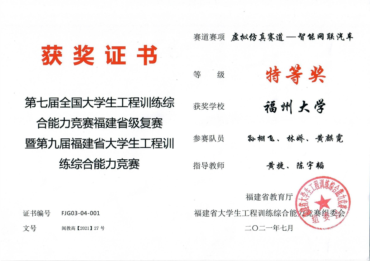 三名本科生黄麒霓(电气学院)、林娇(电气学院)和孙棚飞(数计学院)在大赛中取得福建省第一名的佳绩,并荣获本赛事创办以来福建省首个且唯一特等奖(指导教师为偷拍视频