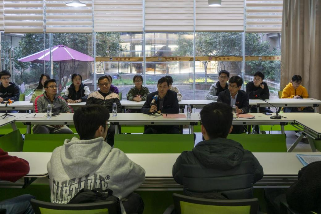 11月17日下午,电气学院体育育人工作座谈会于新楚楼一楼青年马克思主义者研读社召开。体育教学研究部黄文敏老师、院党委书记潘志辉、院党委副书记钟钛申、院团委书记李金土、全体辅导员、“振奋杯”各队长和电气学院田径队队员参加研讨会。会议由院党委副书记钟钛申主持。