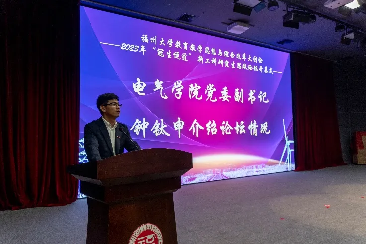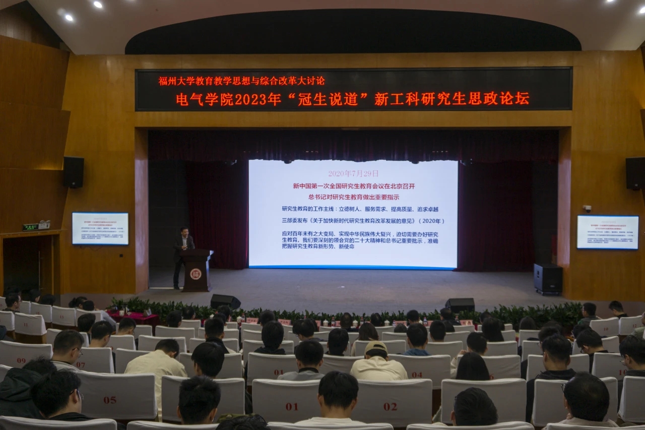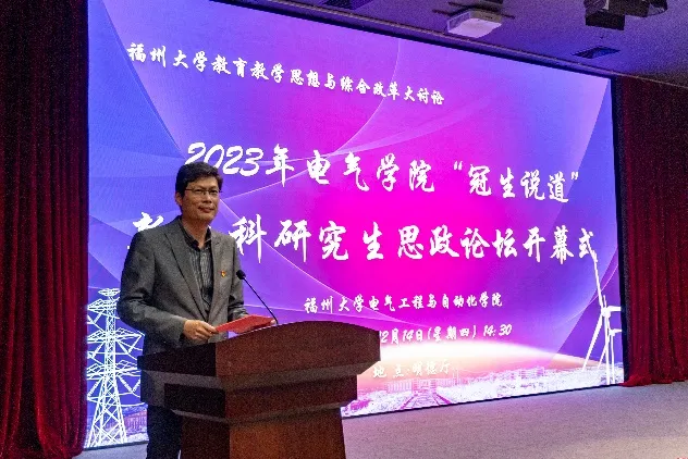 建校初期5个系之一,在研究生人才培养方面一直走在学校前列。他充分肯定了电气学院研究生的思政工作,其斐然成绩先后获中国教育报、共青团中央、中国青年报、党建网等各类主流媒体正面报道近300多次,形成一批可复制、可推广、可持续的经验做法。他表示,电气学院举办新工科研究生思政论坛,是推进研究生思政教育改革创新的有力举措,也是老师、同学一体联动、交流思想、谋划发展的崭新平台。他期待电气学院师生在教育教学思想与综合改革大讨论中贡献电气智慧和方案,并预祝电气学院2023年“冠生说道”新工科研究生思政论坛圆满成功!
