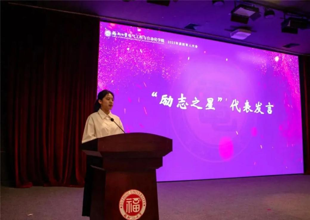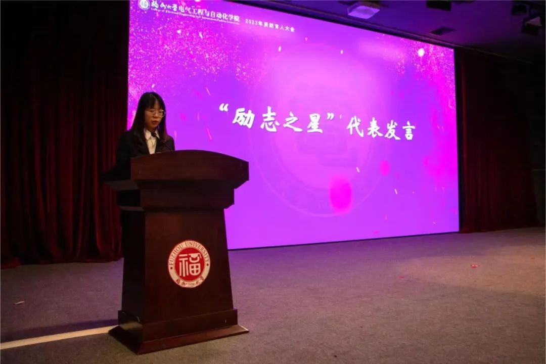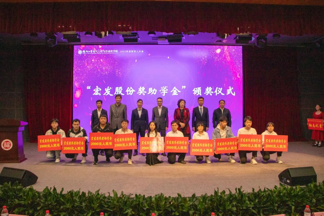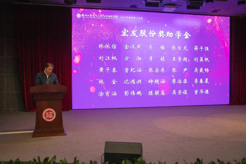 首先,许志红院长对福建泉源电气设备有限公司、福建盛誉电力设备有限公司以及厦门宏发电声股份有限公司对学院事业发展的关心表示感谢。接着,许院长介绍了电气学院坚持高起点谋划资助工作的理念,结合资助育人与立德树人的根本任务,表达了不断提升资助育人的“精度”“温度”“深度”的期望。最后,许院长从三个方面与同学们共勉,一是要志存高远,砥砺前行,追求更大的梦想,到达更远的彼岸;二是要珍惜所有,踔厉奋发,珍惜每一次机会,勇往直前,不断追求更高的目标;三是要坚守初心,牢记使命,在实践中练就真本领,为实现人生价值和社会的繁荣发展而努力奋斗,真正做到“福大电气,顶天立地”。