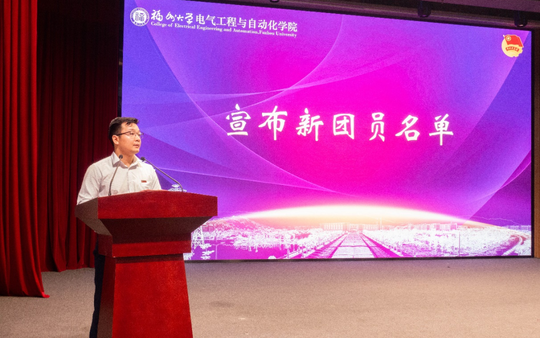 第四项议程, 新团员入团仪式。团委书记李金土老师宣读新团员名单,与会领导为新团员们佩戴团徽,并由学生团委副书记徐嫣孺带领新团员进行了庄重的入团宣誓,勉励新团员们时刻铭记入团初心,坚定共产主义远大理想和中国特色社会主义共同理想,将誓词镌刻在心里、落实到行动上。