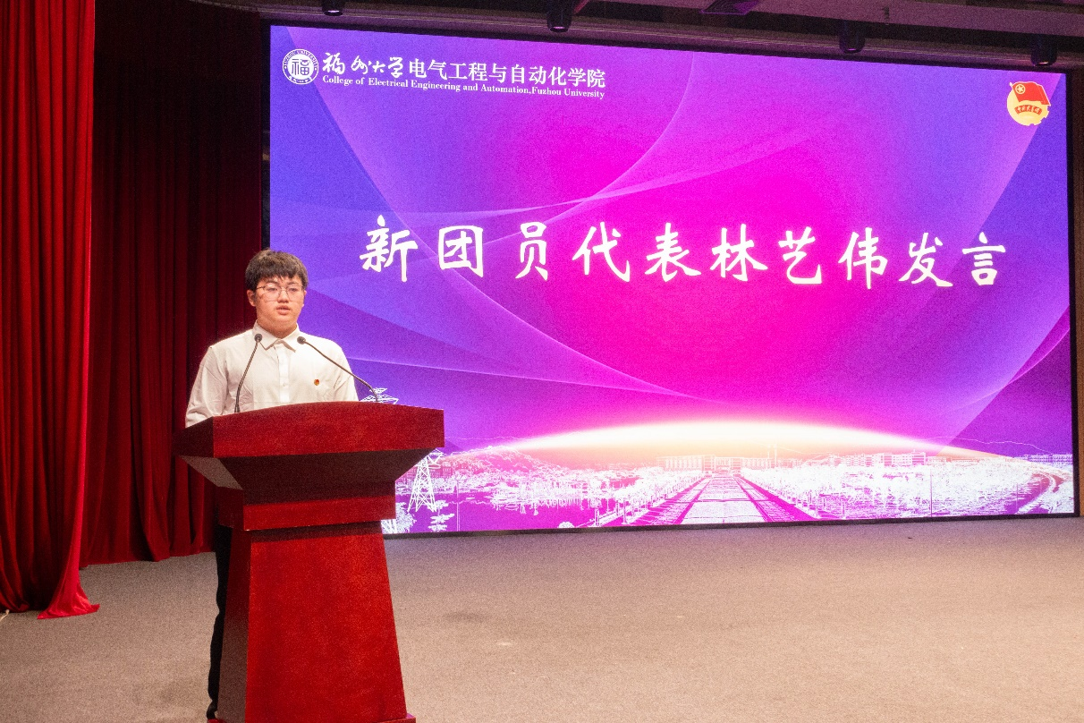 第五项议程 ,新团员代表林艺伟发言。林艺伟谈了作为共青团员的荣耀与责任,表达了对共青团和党的坚定信念。除此之外,他还分享了个人在学习和实践中的经历和成长,强调不忘初心、学以致用和知行合一的重要性,并呼吁青年一代勇做时代的“弄潮儿”,为实现中华民族伟大复兴贡献自己的力量。