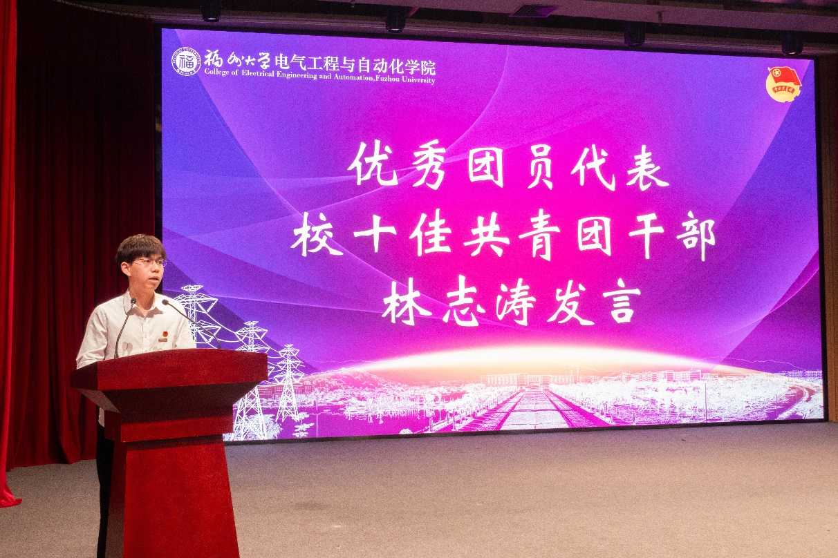 第六项议程 ,优秀团员代表、校十佳共青团干部林志涛发言。林志涛分享了自己在学习和成长中的经历,总结出三点体会与大家共勉:首先,勤奋拼搏是成就自我的关键,青年学子应以饱满的热情投入到学习中,不断拓宽知识视野;其次,探索创新是追求卓越的重要途径,需要脚踏实地打好基础,同时勇于突破理论束缚,实现创新;最后,奉献服务是助力个人成长的重要方式,国家富强和民族复兴是每个人的共同目标,每个人都应为此贡献自己的力量,成为有担当、有责任、有爱国情怀的新时代青年。