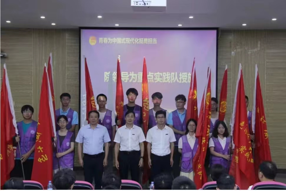 院党委书记潘志辉老师、院党委副书记钟钛申老师和副院长王武教授为学院2024年暑期“三下乡”社会实践15支重点队伍学生代表授旗。红旗飘飘,扬帆起航,朝向党和人民需要的地方进发,预祝本次暑期“三下乡”社会实践圆满成功!