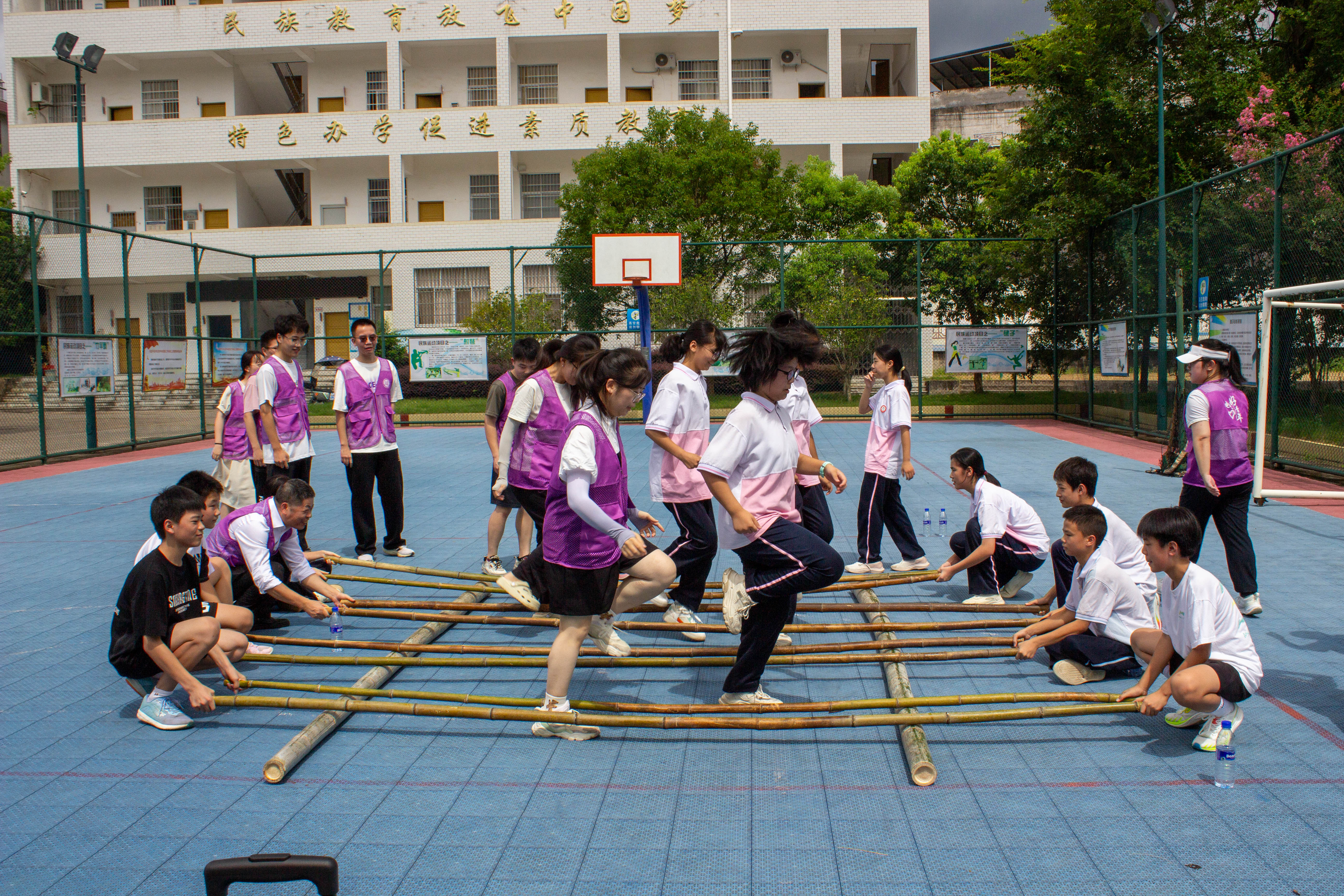 手拉手。伴着一路欢声笑语,民族中学的同学们领着队员们移步到户外运动场,为实践队献上了畲族舞蹈“竹竿舞”,并邀请队员们一同加入,沉浸式体验畲族民俗文化。