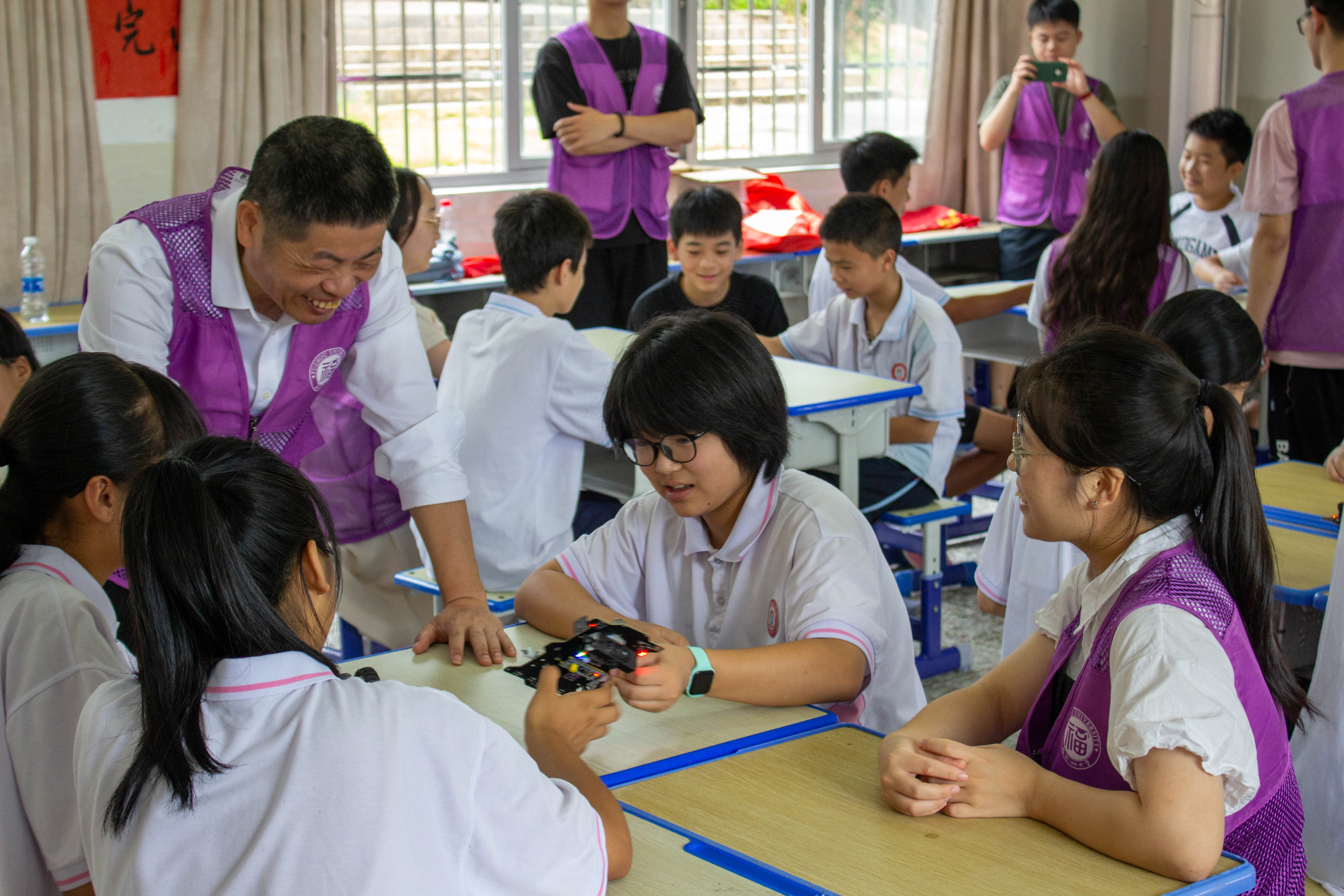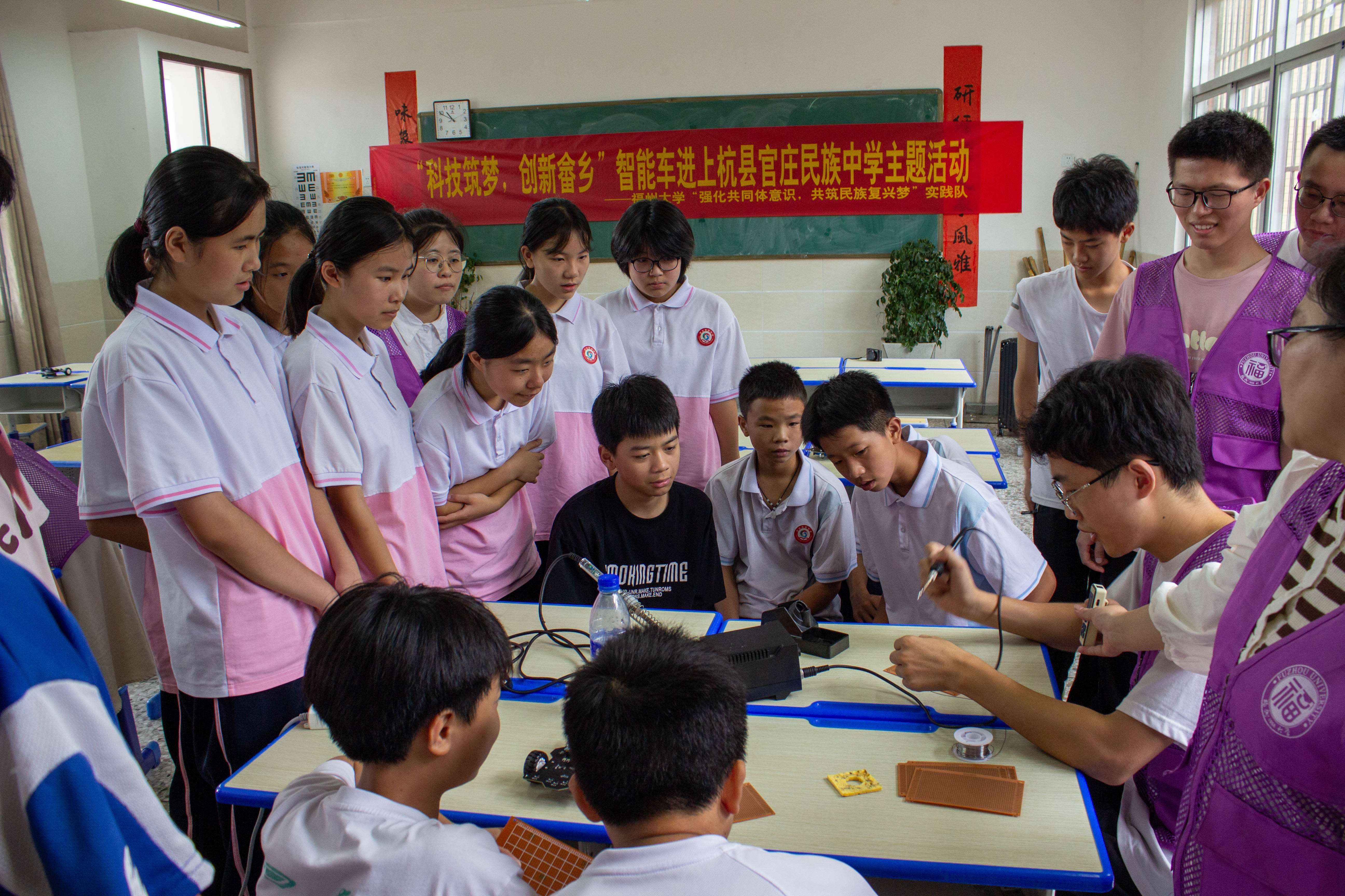 实践队在此前与上杭县官庄民族中学党支部共建的智能制造工作坊中,顺利开展“科技筑梦,创新畲乡”智能车主题活动。队员们发挥专业特长,为当地少数民族学生讲解智能车的组成构造、工作原理、编程调试以及使用方法,并介绍了无人机、机器人等人工智能产品的发展动态。同学们充满好奇,听得津津有味,并在实践队员的引导下分组进行智能车调试。智能车语音控制、手势控制、蓝牙遥控……新奇的体验让同学乐在其中,教室里充满欢声笑语。