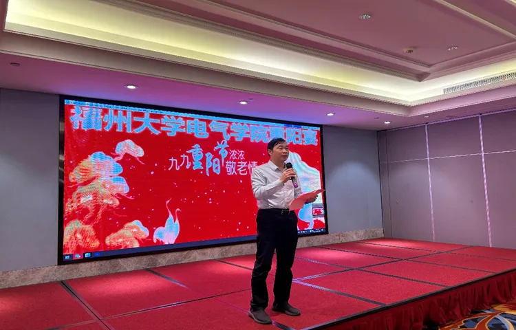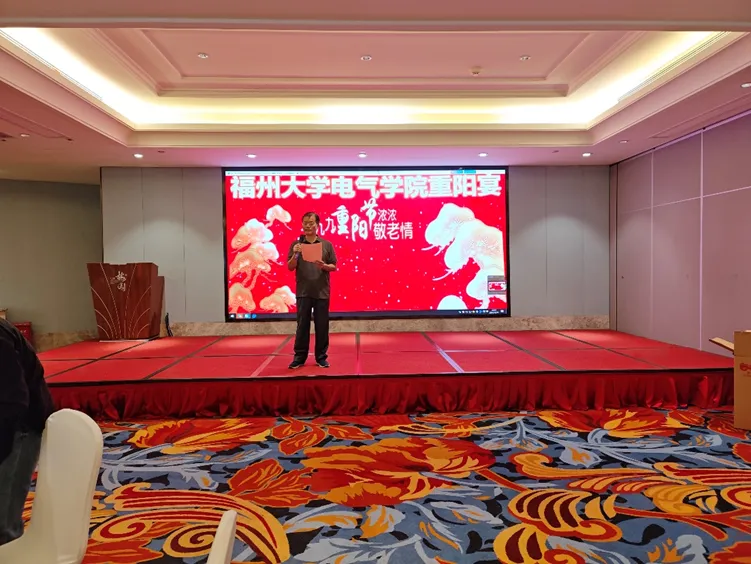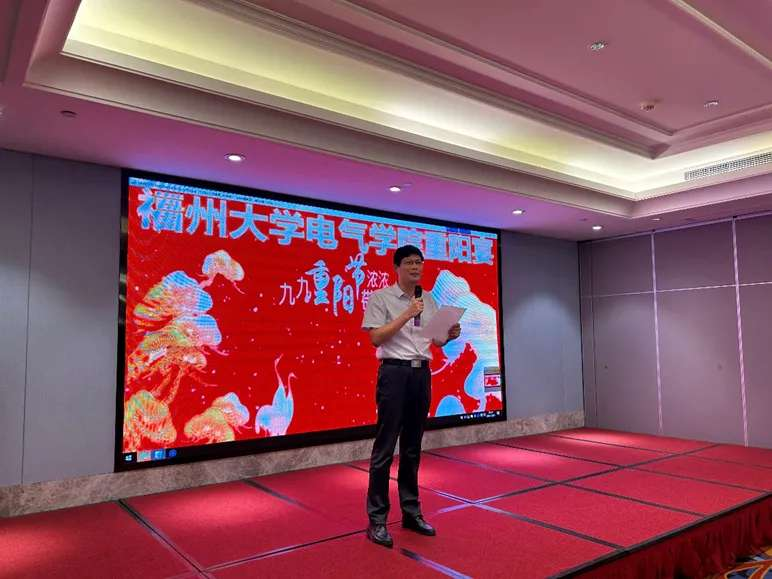 电气学院党委潘志辉书记在发言中表达了对中海创科技集团有限公司近年来支持重阳宴活动的感激之情,对退休教职工为学院的贡献表示充分肯定与感谢,祝愿中海创科技集团有限公司蒸蒸日上,并再次向全体退休教职工致以诚挚的节日祝福。
