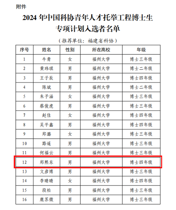 始终致力于青年学生的成长与发展,高度重视并积极组织专项计划的申报工作,动员学院内优秀的博士生踊跃参与。博士研究生郑熙东凭借其扎实的科研能力和卓越的研究成果,经过学院、学校、中国科协及相关学会的严格选拔,成功入选中国科协青年人才托举工程博士生专项计划,充分展示了学院在研究生培养方面的显著成效。未来,学院将继续全力支持该计划的实施,鼓励和支持更多优秀博士生申报后续年度的中国科协青年人才托举工程博士生专项计划,推动创新型青年科技人才的培养,为建设高水平基础研究人才队伍奠定坚实基础。