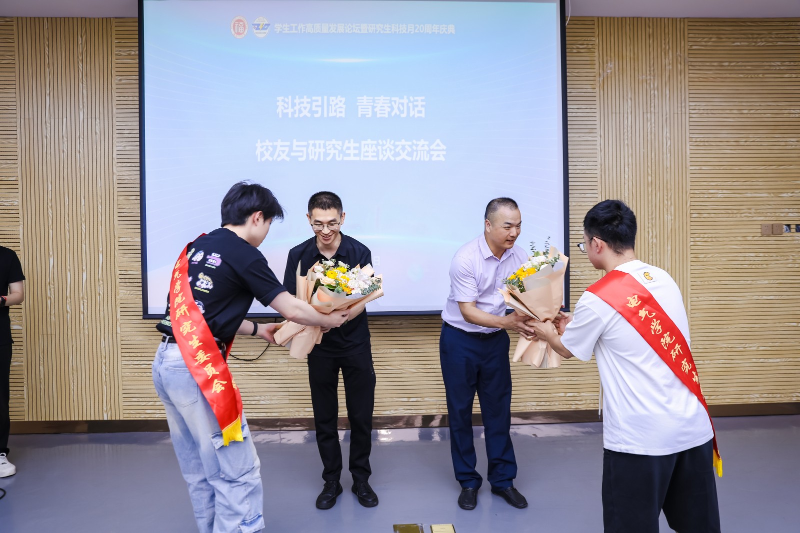 随着交流的深入,同学们纷纷表示收获颇丰,不仅对未来的职业路径有了更清晰的认识,也增强了面对挑战的信心和勇气。活动尾声,研究生代表为两位最美校友科技工作者代表献上鲜花,表达全院师生对他们回校分享的衷心感谢。