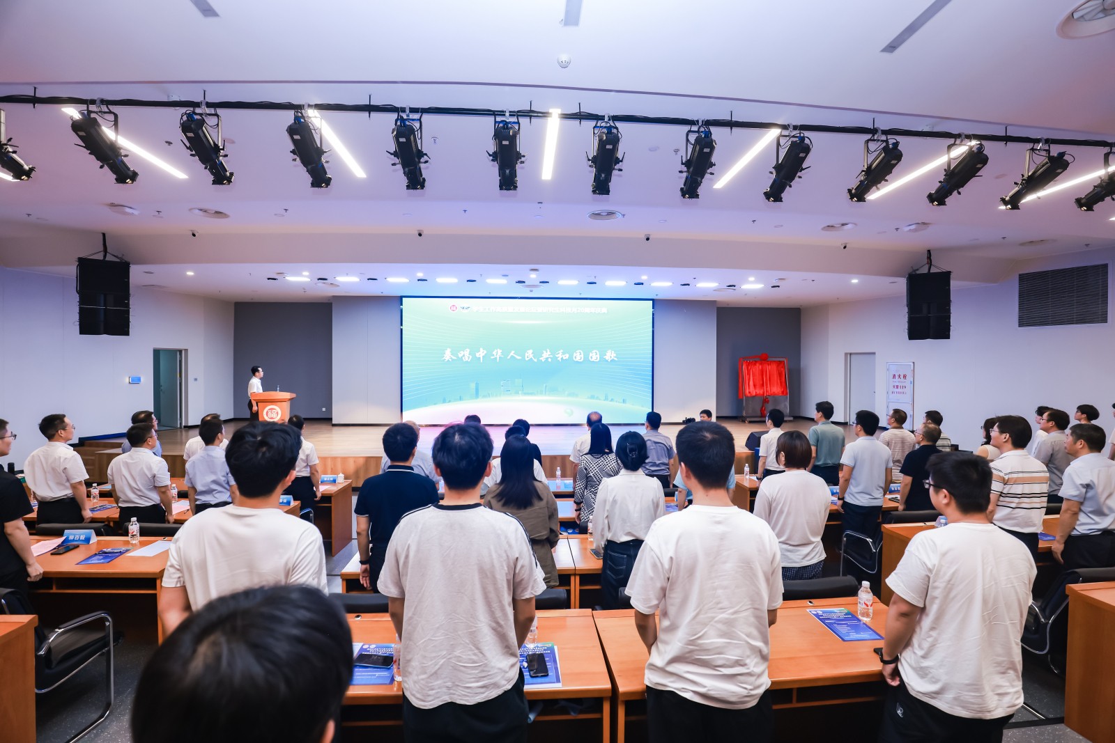 典礼正式开始前,一段浓缩了研究生科技月 20 年发展历程的视频在会场播放,从学术沙龙初创期的探索,到如今融合科技竞赛、校企协同的创新生态,每一帧画面都镌刻着电气人 “创新驱动、思政融合” 的育人初心。接着随国歌奏响,全体起立奏唱,庆典在肃穆的氛围中正式启幕。