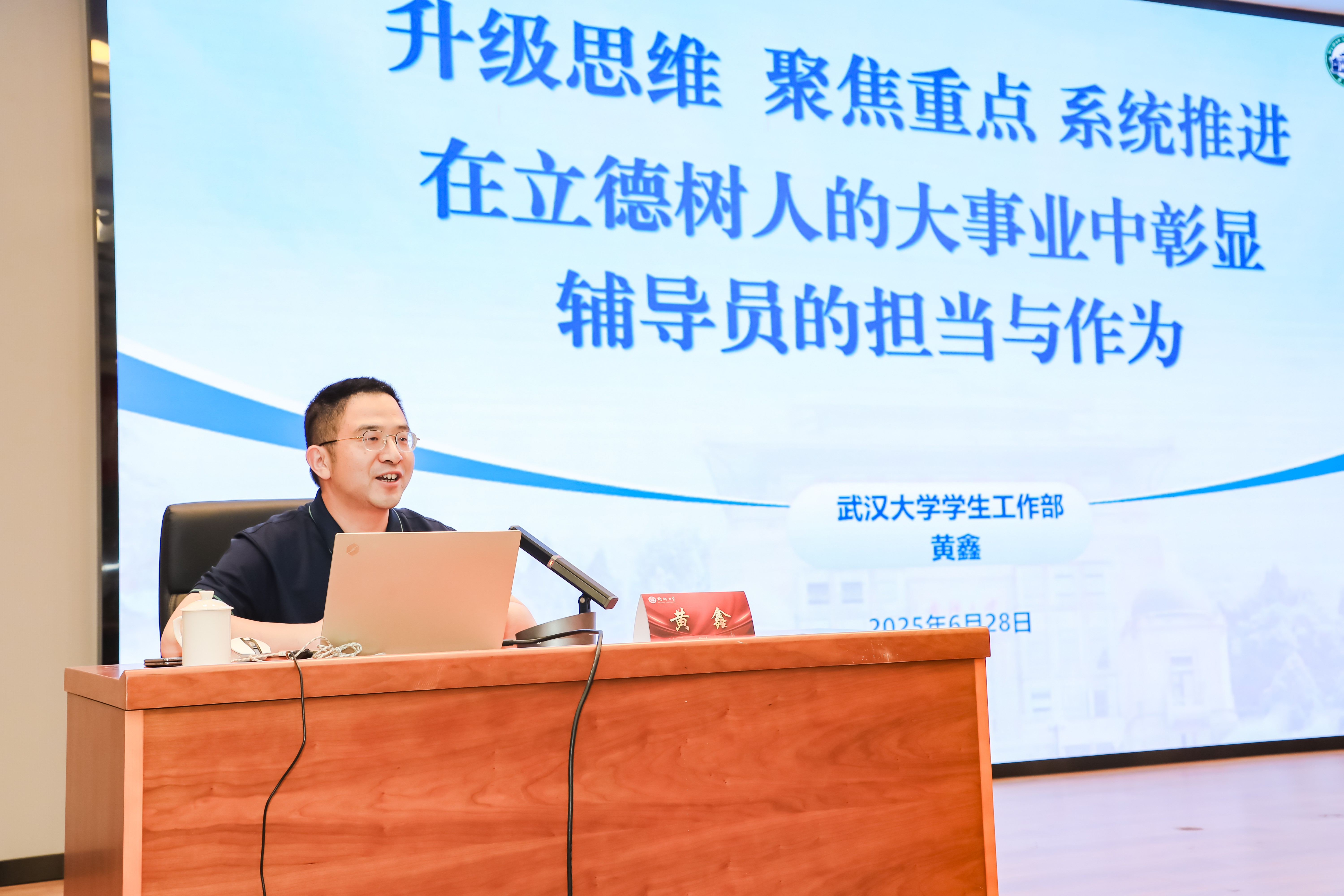 黄鑫部长以“升级思维 聚焦重点 系统推进--在立德树人大事业中彰显辅导员的担当与作为”为主题,强调面对国家实力跃升、治理范式革新与人工智能革命浪潮,辅导员需着力培育具有坚定"四个自信"、能攻克"卡脖子"技术、以"平视世界"姿态直面挑战的新时代青年。