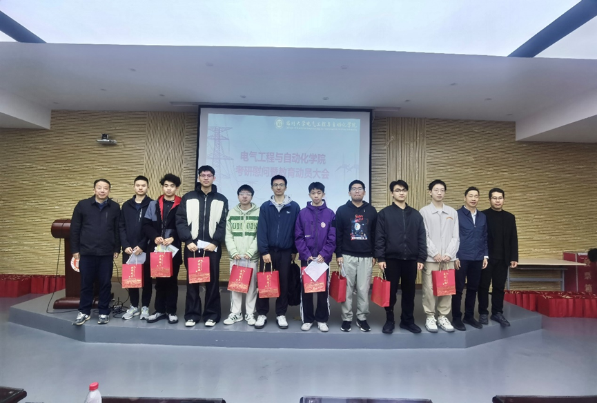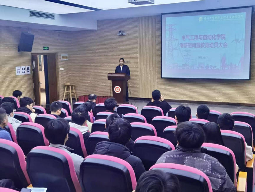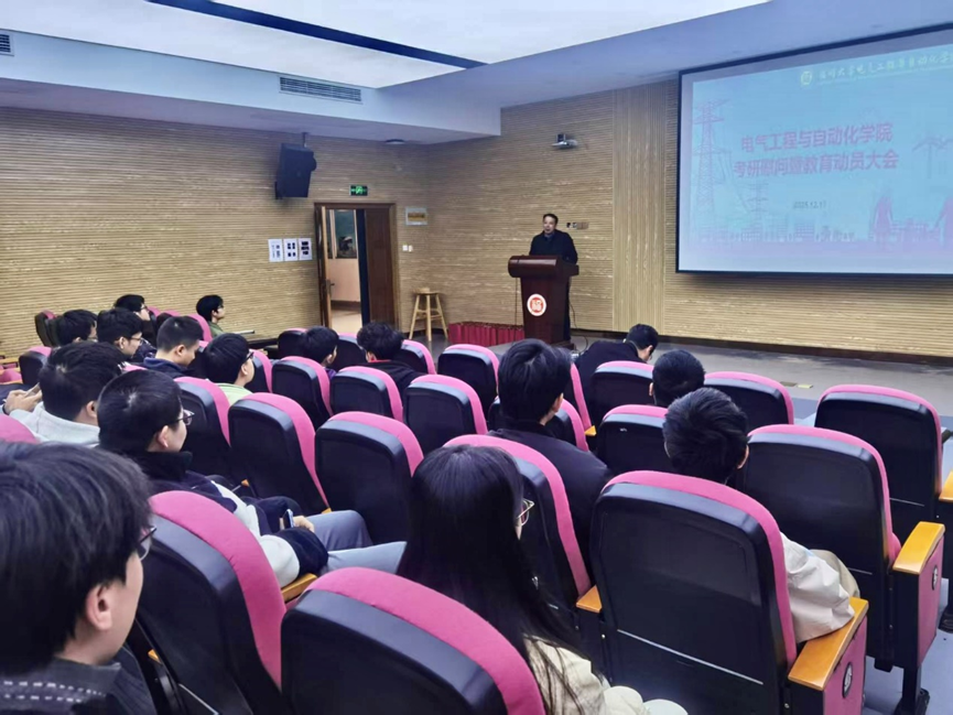 在电气学院新楚楼北230召开了考研慰问暨教育动员大会。此次大会意在鼓舞即将奔赴考场的2026届考研学子,为他们送上真挚关怀与坚定支持,助力学子们以最理想的应考状态迎接这场重要的人生考验。院党委书记潘志辉老师、院党委副书记杜领军老师、副院长王武教授、毕业班辅导员尹万东老师以及2022级考研学子共同出席了本次大会。