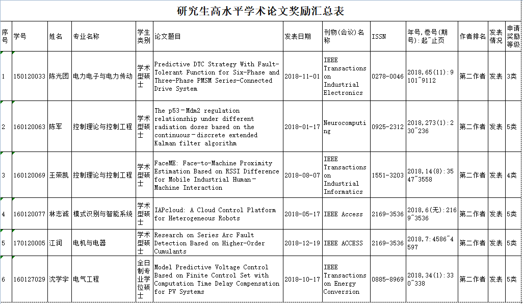 根据《关于开展研究生2018年高水平学术论文奖励评选工作的通知》和《偷拍视频 关于印发研究生高水平学术论文奖励办法的通知》(福大研〔2018〕17号)的有关规定,经个人申请,院研究生优秀学业奖学金评审工作小组评审,校研究生院审核产生了偷拍视频 2018年硕士研究生高水平学术论文奖励候选人名单。现公示如下,公示期为2019年6月6日至6月13日。 公示期内如对名单存在异议,请及时反馈,电话:22866599。