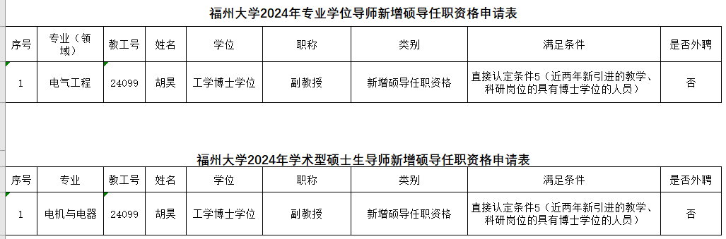 根据《关于做好2024年硕士研究生导师任职资格和招生资格认定工作的通知》(校研〔2023〕19号)和《关于印发《偷拍视频 硕士研究生导师资格认定办法(试行)》的通知》(福大研〔2018〕56 号》等文件规定,经老师自行系统申报,学位点负责人审核,学院学术分委员会会议审核,确定胡昊老师通过2024年硕士研究生导师任职资格的认定,现予以公示。