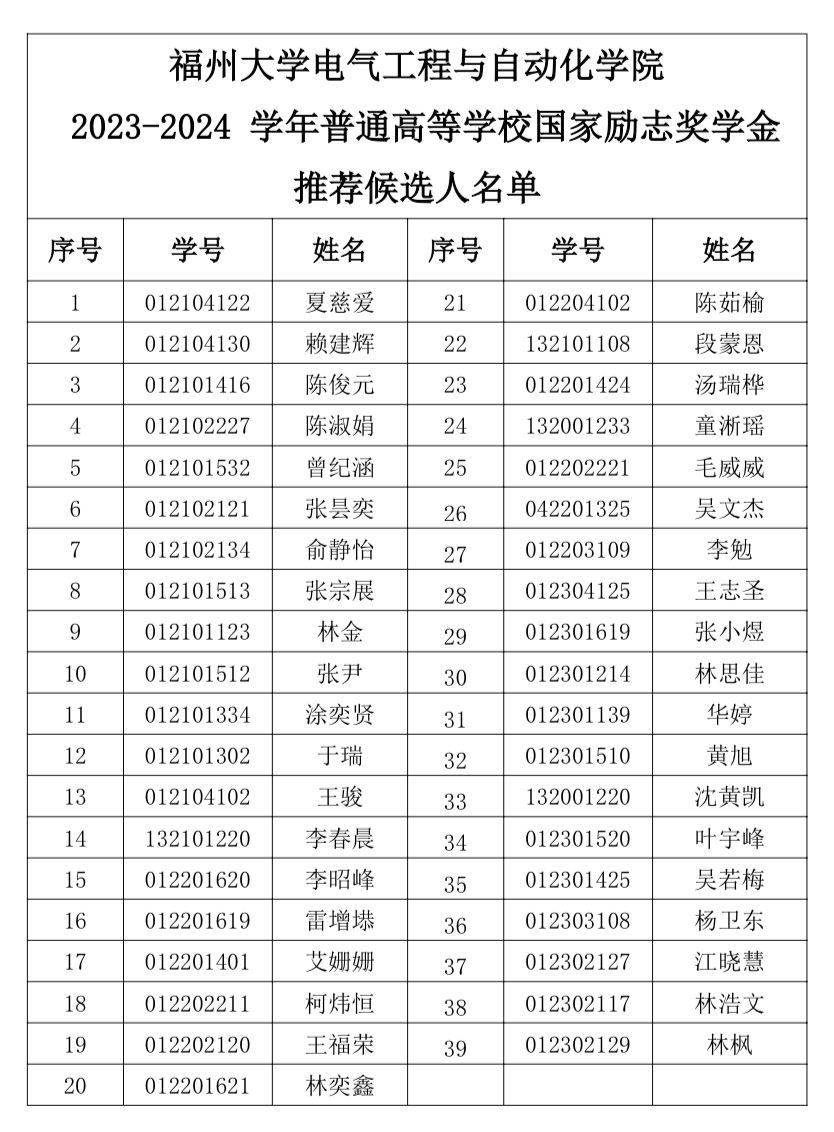 根据偷拍视频 《关于做好 2023-2024 学年本科生国家励志奖学金》文件要求,经同学申请,学院资格审核,并经学院国家励志奖学金评审委员会评审。现学院国家励志奖学金评审委员会决定推荐李昭峰等 39 名同学参与偷拍视频 2023-2024 学年“普通高等学校国家励志奖学金”评定。现将推荐候选人名单公示如下,公示时间为 2024 年 9 月 23日-2024 年 9 月 26 日,在此期间若对上述名单存有异议,请及时予以反馈。