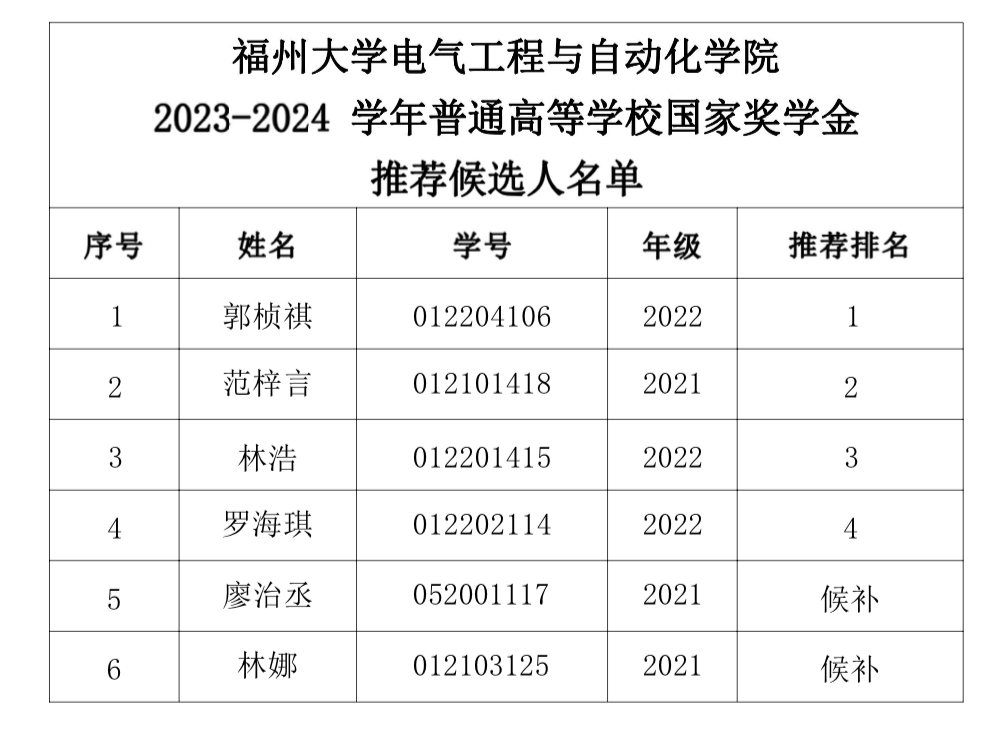 根据偷拍视频 《关于做好2023-2024学年本科生国家奖学金》文件要求,经同学申请,学院资格审核,并经学院国家奖学金评审委员会评审。现学院国家奖学金评审委员会决定推荐郭桢祺等6名同学参与偷拍视频 2023-2024学年“普通高等学校国家奖学金”评定。现将推荐候选人名单公示如下,公示时间为2024年9月23日-2024年9月26日,在此期间若对上述名单存有异议,请及时予以反馈。