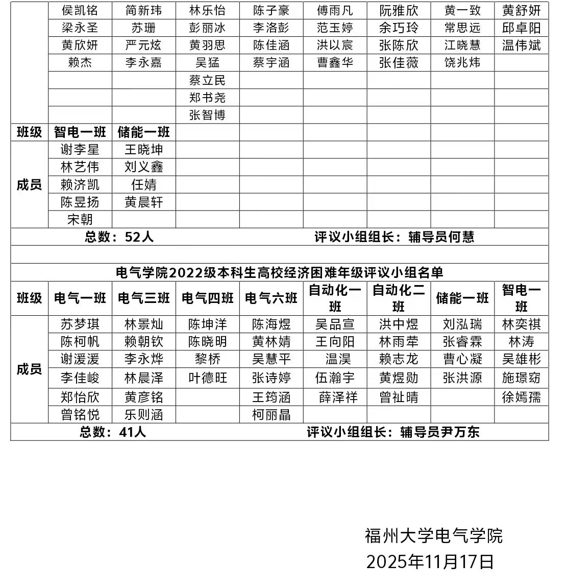 电气学院关于2025-2026学年本科生家庭经济困难学生认定领导小组成员及年级评议小组成员的公示