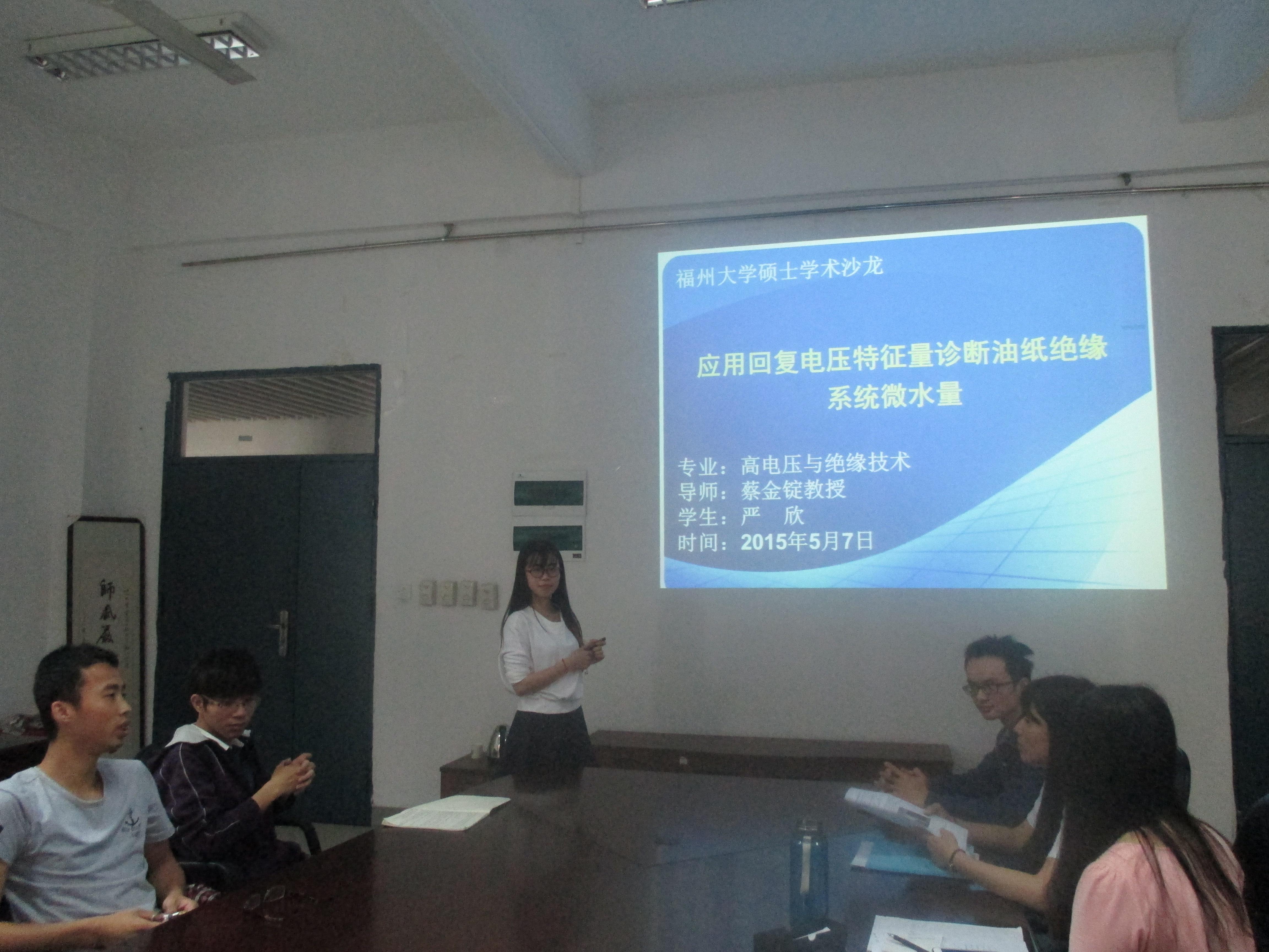 首先是曾静岚同学关于《基于极化去极化法的油纸绝缘系统老化状态评估》的报告,其中详细介绍了极化去极化电流法的研究现状,对于介质响应函数的改进,以及极化支路的判断和测量误差的解法方案。接着是严秋问同学的《基于中低压配网绝缘瞬时性故障的研究》,针对瞬时性故障信号的特点,通过HHT技术对信号进行分析处理,并提取出作为判别故障线路的特征量。紧接着,王树洪同学的《基于方向性遗传-粒子群混合算法的有源配电网无功优化》报告以网损和电压偏差之和最小为目标,建立了含分布式电源的配电网无功优化的数学模型,提出了一种方向性的,结合遗传算法(GA)和粒子群算法(PSO)的有源配电网无功优化方法。其次是严欣同学的《应用回复电压特征量评估油纸绝缘设备微水量》,通过应用油纸绝缘变压器弛豫响应等效电路及回复电压极化谱特征量,探讨了微水含量与回复电压特征量之间的关系,同时结合分析比较绝缘电阻、极化电阻以及极化电容的变化规律来辅助判断变压器的受潮情况并通过现场测试的实例验证了报告结论的正确性。最后是吴巧玲同学的《故障早期检测的断路器分断短路电流预测方法》,提出了基于直流分量和基波分量递推的零参数故障电流预测算法,采用断路器相控分段CFI技术来控制高压输电线路短路故障,达到对短路电流过零点的预测。