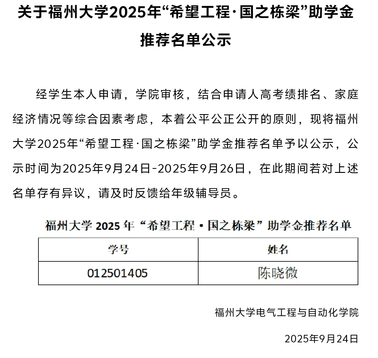 关于福州大学2025年“希望工程·国之栋梁”助学金推荐名单公示