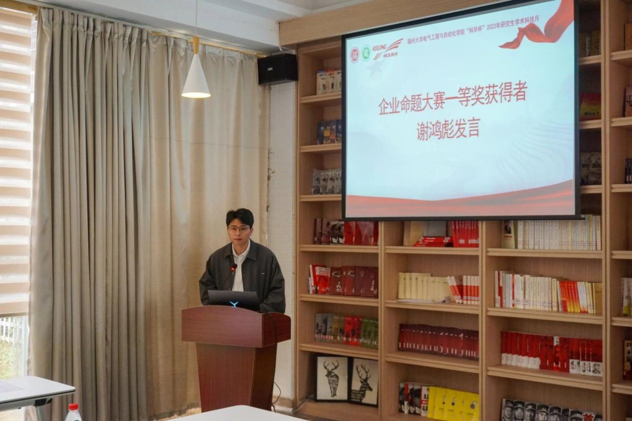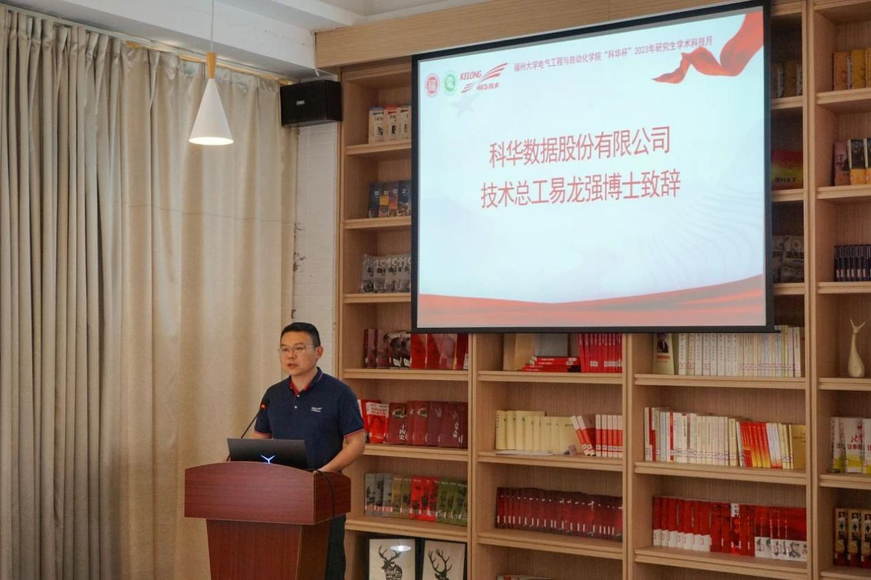 随后,科华数据股份有限公司技术总工易龙强博士致辞。他向在场同学介绍了科华公司的辉煌发展历程,并表达了对福大学子的热忱欢迎。易博士高度评价了学术科技月活动获奖队伍的优异表现,并提出了宝贵的建议,鼓励同学们多做实物,积极参与各类科技竞赛。鉴于赛道的高度契合,易博士鼓励获奖队伍积极参与“炬火种·燃新薪”厦门火炬高新区高校专业新星挑战大赛,在更广阔的舞台展现才华。最后,易博士表达了深化科华公司与学院合作交流的愿望,期待双方能够共同推动产学研深度融合,为社会培养更多优秀人才。