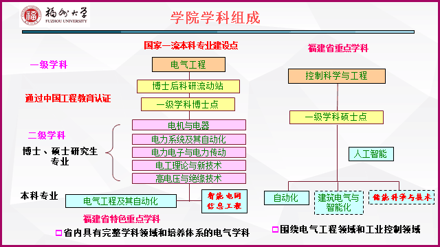 电气工程学科是国家一流本科专业建设点、福建省省级特色重点学科,2018年通过了中国工程教育认证,其中电器专业博士点是全国最早一批建立的电器专业博士点,也是福州大学最早建立的两个博士学位授权点之一。控制科学与工程学科是福建省重点学科。目前,学院拥有电气工程一级学科博士点和博士后科研流动站、控制科学与工程一级学科硕士点、新能源发电与电能变换福建省重点实验室、福建省电器智能化工程技术研究中心、工业自动化控制技术与信息处理福建省高校实验室、福建省电器行业技术开发基地、福建省医疗器械行业技术开发基地、清真食品产业科技创新公共服务平台、福建省研究生培养创新基地和福建省专业学位研究生联合培养示范基地等。电气工程学科在福建省内建立最早,在省内具有最完整学科科研方向与人才培养体系,在国家“双一流”建设中,电气工程学科列入福建省一流学科(高原学科)建设计划。