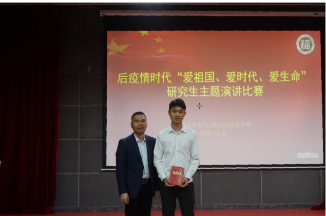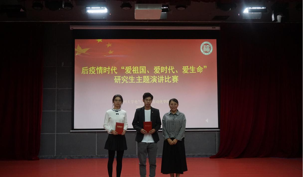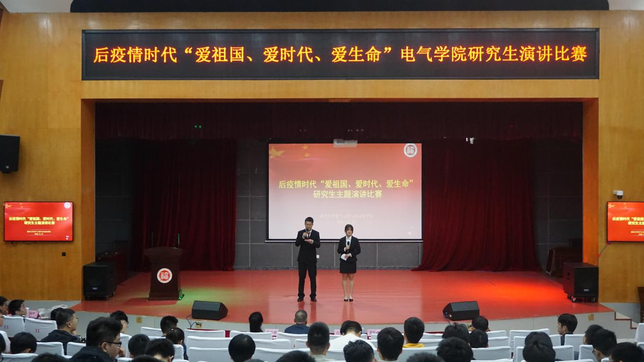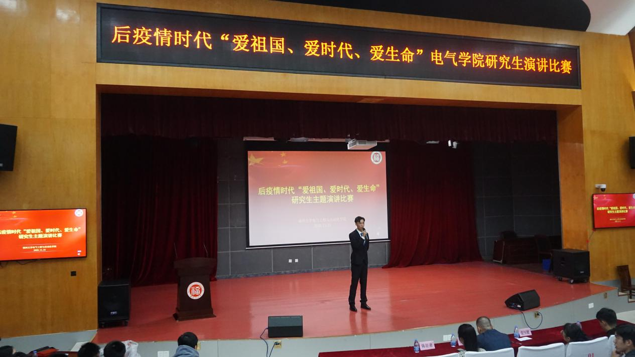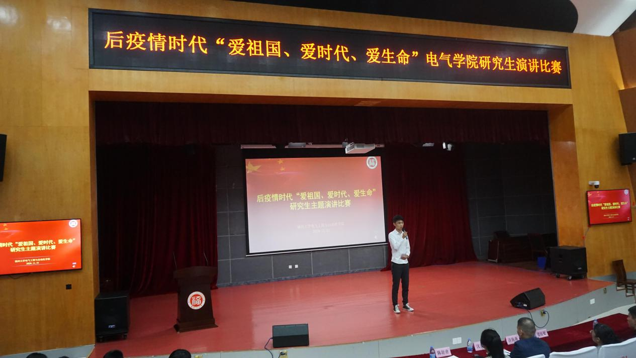 2020年11月21日下午2点,电气学院后疫情时代“爱祖国、爱时代、爱生命”研究生主题演讲比赛在校图书馆明德厅顺利落幕。本次大赛是围绕“爱国家、爱时代、爱生命”开展的主题教育演讲比赛,目的在于引导广大师生树立正确的人生观与价值观,继承和发扬爱国主义传统,实现人生价值,追求生命的意义。担任本次比赛的评委有学院团委书记沈庆斌老师、研究生辅导员许海燕老师、研会主席张钰健同学和研会副主席陈舒迪同学。