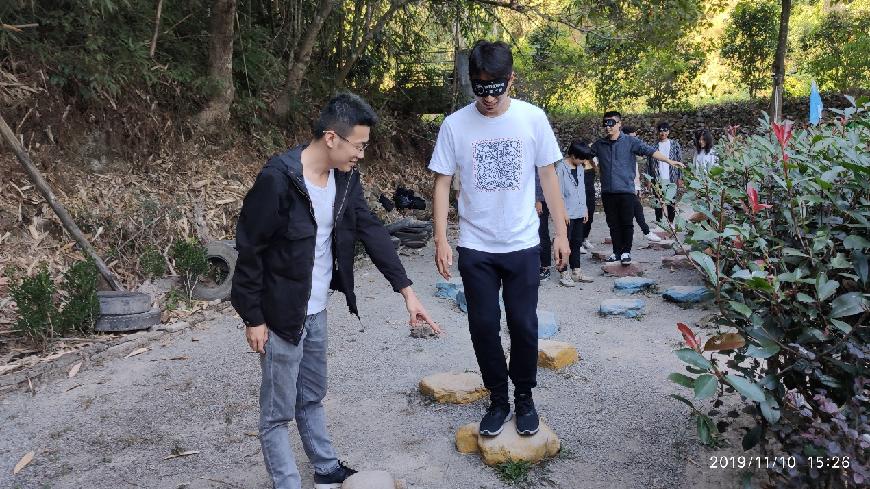 在大家体验了溜索带来的高空快感后,紧接着就是本次团建的重头戏---突出重围,队员们两两合作,一名队员蒙上双眼,另一名队员指导同伴通过地雷阵、壕沟、土坡、独木桥等障碍。在这片充满路障的土地,可以看到队员之间良好的配合和有效的沟通,把自己交给你,你的指令便是我前进的脚步。