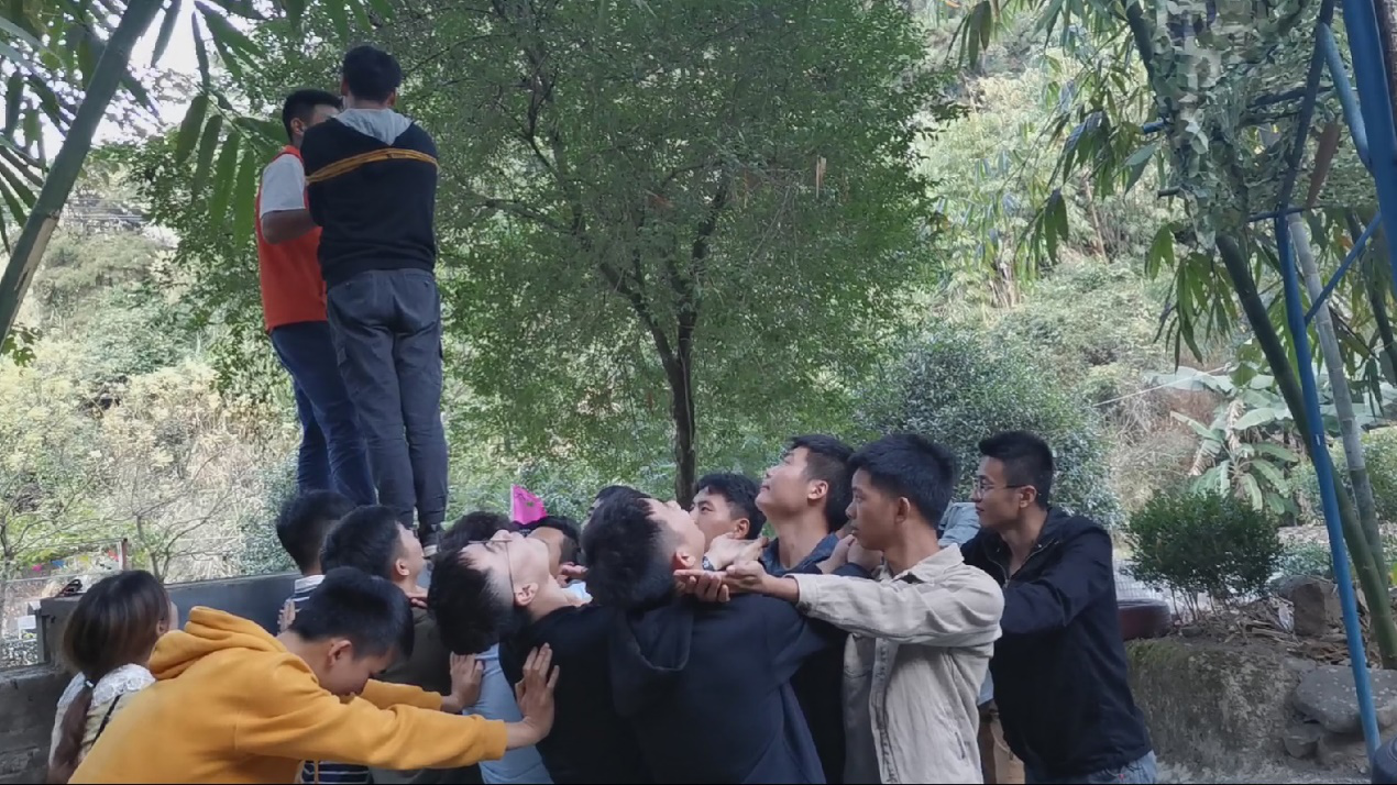 最后一个游戏是信任背摔,参加的每个队员都要笔直的从1.5米的平台上向后倒下,而其他队员则伸出双手接住并保护他。生活中每个人都希望获得他人的信任,而获得他人信任的前提便是先信任他人。从这个游戏中我们可以感受到队员们彼此之间的信任,我相信你们在我身后所以我敢倒下,这句话应该是这个游戏最好的诠释。
