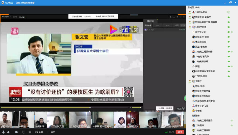 研究生各党支部和全体党员第一时间走在抗“疫”最前沿。1月31日开始,全院研究生就以支部为单位进行分组,党员任组长,以“组长-年级负责人-支部负责人”统筹协调的机制每天开展全覆盖、零遗漏登记排查,执行“人盯人”,力争“不迟报、不漏报、不谎报、不瞒报、不错报”。鉴于少数党员在前期疫情防控工作表现不佳,会议开展了批评与自我批评,同时鞭策其他党员同志引以为戒,克服松懈思想、麻痹心理和厌战情绪,为最后打赢疫情防控阻击战承担应有的责任。同时,对本支部非党员群众,支部将安排宿舍或实验室党员同学进行一对一帮扶,确保电气研究生的疫情防控工作一个不掉队。近期偷拍视频
