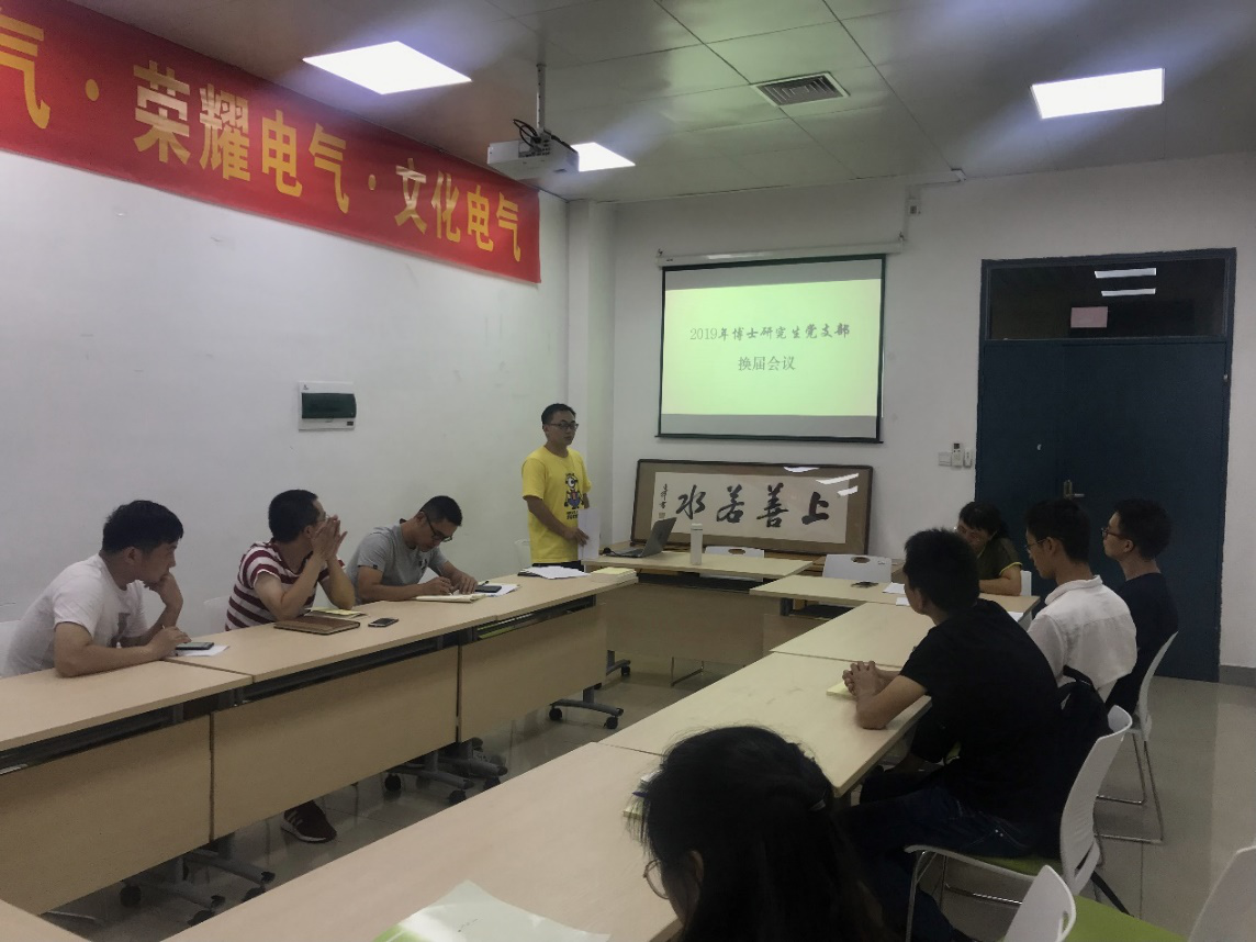 博士研究生党支部于2019年9月10日晚上7点在电气学院楼北211召开书记微党课与换届会议。此次会议由组织委员陈红星同志主持,博士研究生党支部全体党员同志出席本次会议。