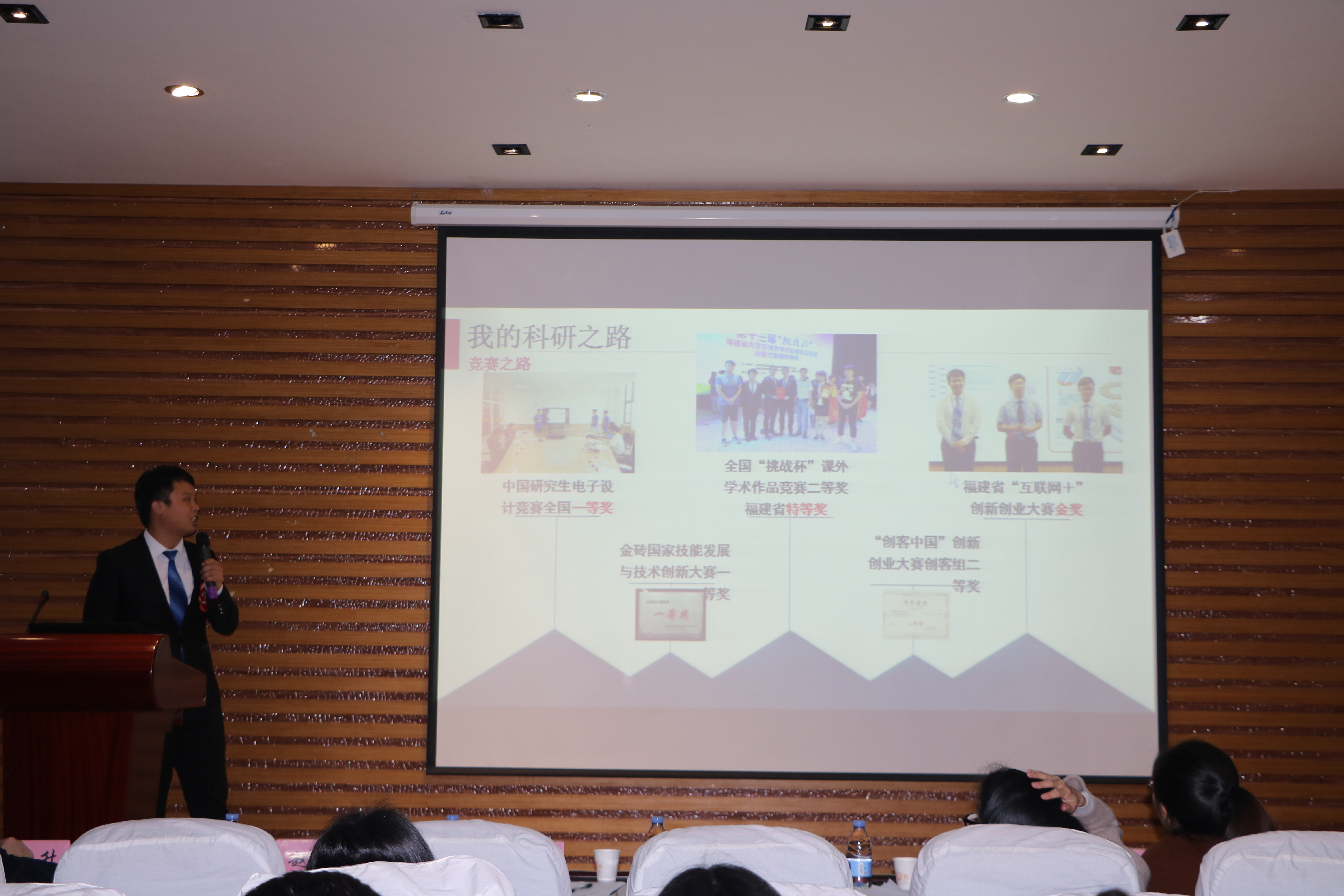 主持人热情洋溢的开场白后,比赛拉开了序幕,经抽签决定出场顺序,来自不同学院共25位优秀选手依次上台,展示自己丰富多彩的科研之路。其中,来自电气学院的张伟豪同学表现尤为突出。通过一段无线充电视频,张伟豪同学向大家介绍了自己及其团队的无线充电技术研发之路,分享了自己在科研道路上所斩获的累累果实,不仅如此,张伟豪同学在科研之余还积极参与学生工作与体育文化活动,因此获得评委们的一致好评。