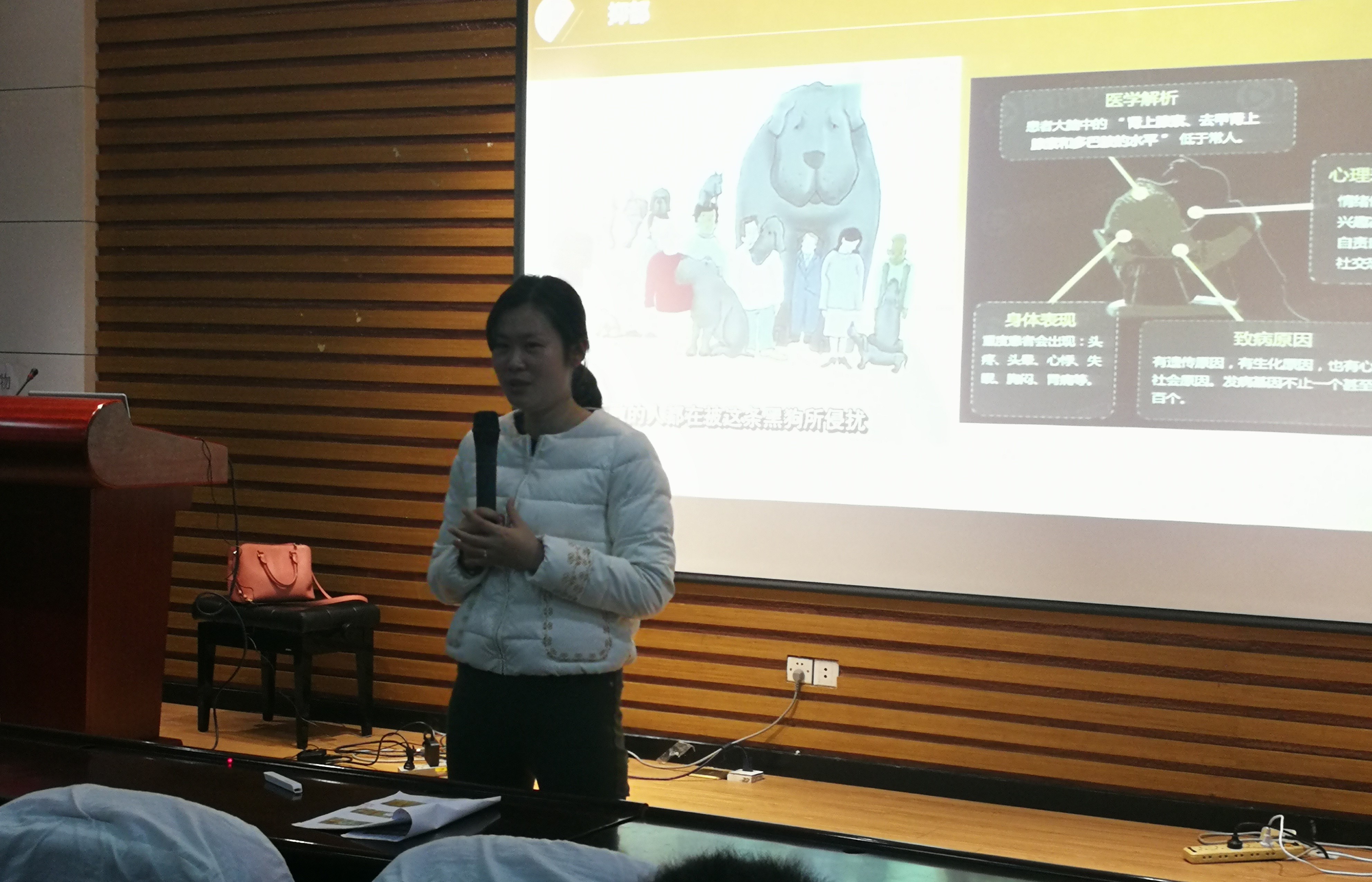 讲座伊始,许琳玲老师给我们介绍了一种由心理疾病引发的最大危害——即自杀。之所以把自杀称之为危害最大并不仅仅因为它摧残了某个生命某个家庭,为此许老师特意举了一个现实发生的案例,这是一个对至少六个人造成严重伤害的自杀案例。可见,对于有自杀倾向的人,周围的鼓励与引导显得多么重要。
