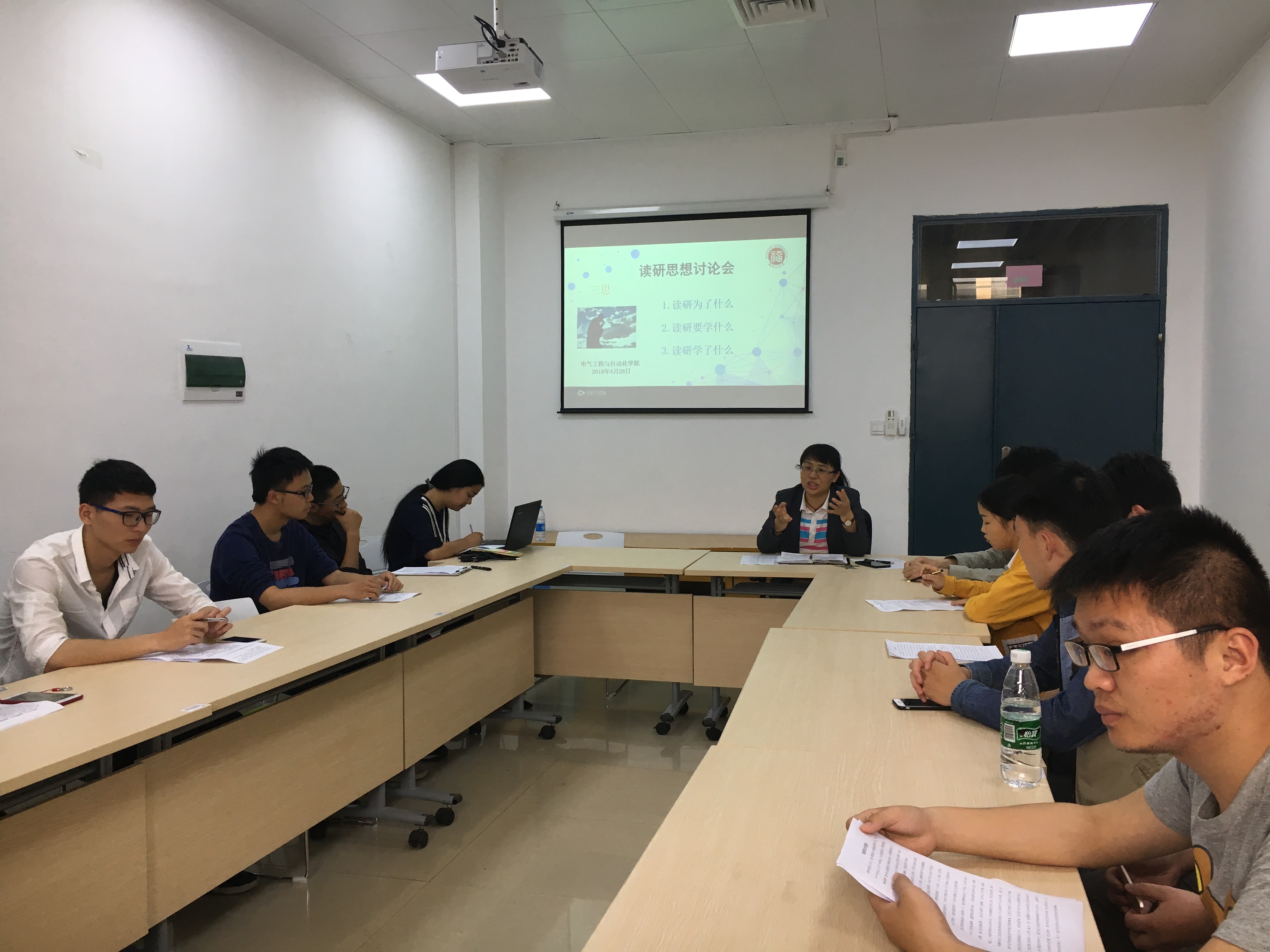 为了凝聚研究生奋力成长成才的共识,引导研究生争取做新时代优秀学子。电气学院分别于2018年4月13日晚8:00在63#4楼电气研究生活动室、2018年4月28日下午4:30在新楚楼北211会议室举行了“读研为了什么”、“读研要学什么”、“读研学了什么”思想讨论。讨论会由研究生辅导员许海燕老师主持。两次会议以研究生入党积极分子以及研究生阶段课程出现重修的同学为代表,共计56人参与。此外,2015级优秀毕业研究生代表、两次国奖获得者张伟豪同学也到场交流。两次讨论会都围绕着研究生读研的最终目的而展开讨论。